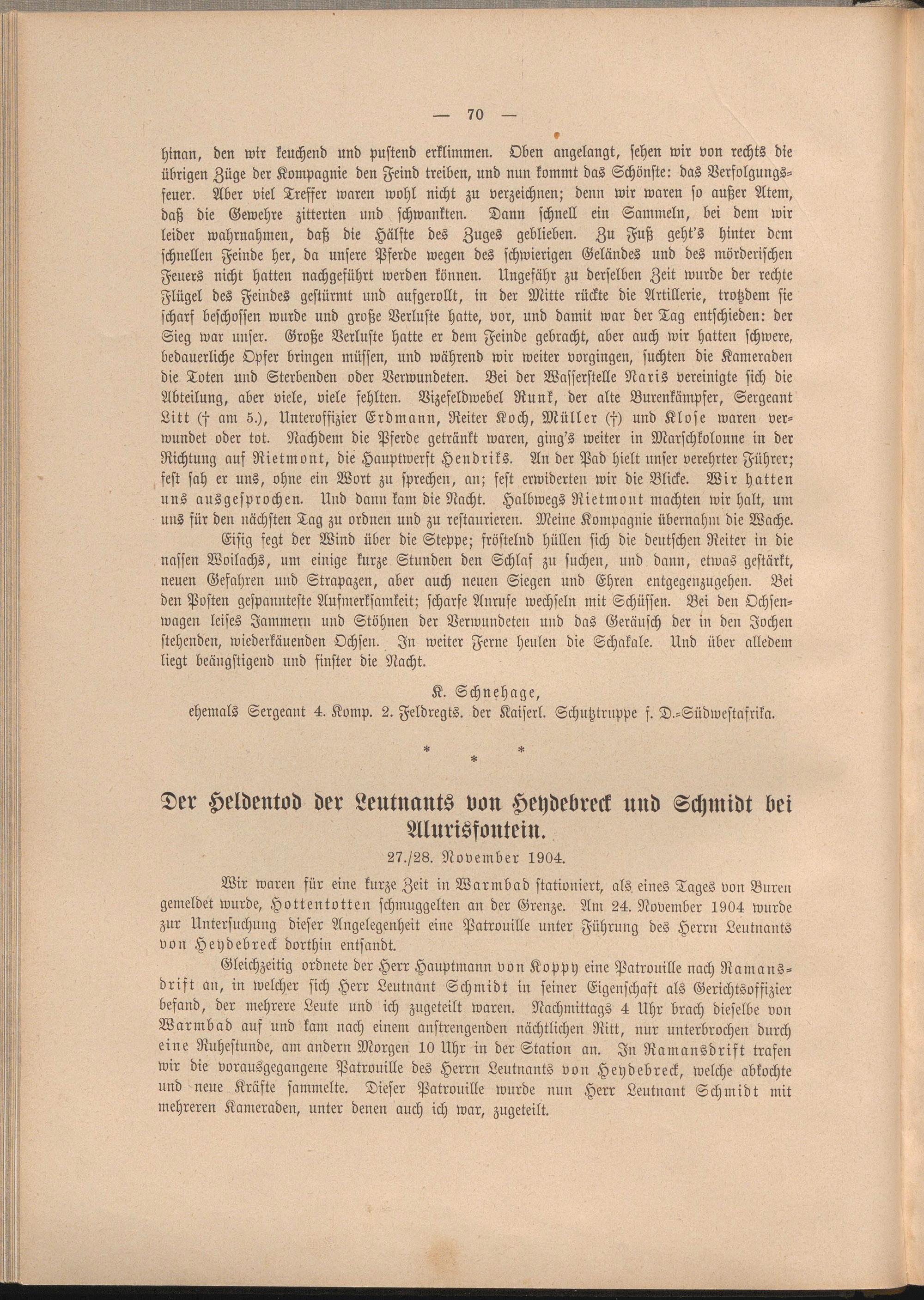 hinan, den wir keuchend und pustend erklimmen. Oben angelangt, sehen wir von rechts die übrigen Züge der Kompagnie den Feind treiben, und nun kommt das Schönste: das Verfolgungsfeuer. Aber viel Treffer waren wohl nicht zu verzeichnen; denn wir waren so außer Atem, daß die Gewehre zitterten und schwankten. Dann schnell ein Sammeln, bei dem wir leider wahrnahmen, daß die Hälfte des Zuges geblieben. Zu Fuß geht's hinter dem schnellen Feinde her, da unsere Pferde wegen des schwierigen Geländes und des mörderischen Feuers nicht hatten nachgeführt werden können. Ungefähr zu derselben Zeit wurde der rechte Flügel des Feindes gestürmt und aufgerollt, in der Mitte rückte die Artillerie, trotzdem sie scharf beschossen wurde und große Verluste hatte, vor, und damit war der Tag entschieden: der Sieg war unser. Große Verluste hatte er dem Feinde gebracht, aber auch wir hatten schwere, bedauerliche Opfer bringen müssen, und während wir weiter vorgingen, suchten die Kameraden die Toten und Sterbenden oder Verwundeten. Bei der Wasserstelle Naris vereinigte sich die Abteilung, aber viele, viele fehlten. Vizefeldwebel Runk, der alte Burenkämpfer, Sergeant Litt (f am 5.), Unteroffizier Erdmaun, Reiter Koch, Müller (f) und Klose waren verwundet oder tot. Nachdem die Pferde getränkt waren, ging's weiter in Marschkolonne in der Richtung auf Rietmont, die Hauptwerft Hendriks. An der Pad hielt unser verehrter Führer; fest sah er uns, ohne ein Wort zu sprechen, an; fest erwiderten wir die Blicke. Wir hatten uns ausgesprochen. Und dann kam die Nacht. Halbwegs Rietmont machten wir halt, um uns für den nächsten Tag zu ordnen und zu restaurieren. Meine Kompagnie übernahm die Wache.