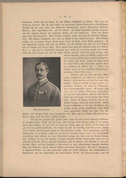 orientieren, streckte ihn eine Kugel, die sein Gehirn durchbohrte, zu Boden. Nun war alle Hoffnung verloren! Als ich mich umsah, um mit meinen übrigen Kameraden zu beratschlagen, bemerkte ich nur noch, außer zwei stöhnenden Verwundeten, meinen Nebenmann (Gefreiter Moser). Sein letztes Wort war: „Es ist vorbei!" In diesem Augenblick gewahrte ich hinter mir drei schwarze Gegner mit erhobenen Kolben auf uns losstürmen. Unter den Hieben erlag mein letzter Kamerad. Mein Gewehr erfassend, rannte ich durch die feindliche Schützenlinie. Mit Kugeln überschüttet, traf mich ein Schuß in den rechten Oberarm. Mein Gewehr entflog mir in großem Bogen. Gleich darauf brach ich hinter einem Busch zusammen. In dem Augenblick erreichte mich einer der Wilden, lud sein Gewehr und zielte bei einer Distanz von drei Schritt auf meinen Kopf. Mein ganzes Leben ging mir nochmals durch mein Gehirn.