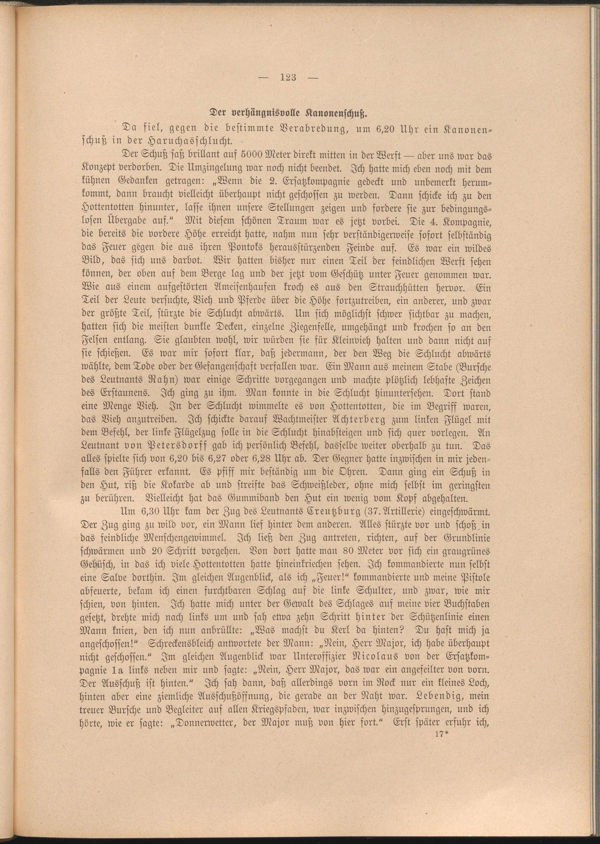 Der Schuß saß brillant auf 5000 Meter direkt mitten in der Werft — aber uns war das Konzept verdorben. Die Umzingelung war noch nicht beendet. Ich hatte mich eben noch mit dem kühnen Gedanken getragen: „Wenn die 2. Ersatzkompagnie gedeckt und unbemerkt herumkommt. dann braucht vielleicht überhaupt nicht geschossen zu werden. Dann schicke ich zu den Hottentotten hinunter, lasse ihnen unsere Stellungen zeigen und fordere sie zur bedingungslosen Übergabe auf." Mit diesem schönen Traum war es jetzt vorbei. Die 4. Kompagnie, die bereits die vordere Höhe erreicht hatte, nahm nun sehr verständigerweise sofort selbständig das Feuer gegen die aus ihren Pontoks herausstürzenden Feinde auf. Es war ein wildes Bild. das sich uns darbot. Wir hatten bisher nur einen Teil der feindlichen Werft sehen können, der oben auf dem Berge lag und der jetzt vom Geschütz unter Feuer genommen war. Wie aus einem aufgestörten Ameisenhaufen kroch es aus den Strauchhütten hervor. Ein Teil der Leute versuchte, Vieh und Pferde über die Höhe fortzutreiben, ein anderer, und zwar der größte Teil. stürzte die Schlucht abwärts. Um sich möglichst schwer sichtbar zu machen, hatten sich die meisten dunkle Decken, einzelne Ziegenfelle, umgehängt und krochen so an den Felsen entlang. Sie glaubten wohl. wir würden sie für Kleinvieh halten und dann nicht auf sie schießen. Es war mir sofort klar. daß jedermann, der den Weg die Schlucht abwärts wählte, dem Tode oder der Gefangenschaft verfallen war. Ein Mann aus meinem Stäbe (Bursche des Leutnants Nahn) war einige Schritte vorgegangen und machte plötzlich lebhafte Zeichen des Erstaunens. Ich ging zu ihm. Man konnte in die Schlucht Hinuntersehen. Dort stand eine Menge Vieh. In der Schlucht wimmelte es von Hottentotten, die im Begriff waren, das Vieh anzutreiben. Ich schickte darauf Wachtmeister Achterberg zum linken Flügel mit dem Befehl, der linke Flügelzug solle in die Schlucht hinabsteigen und sich quer vorlegen. An Leutnant von Petersdorff gab ich persönlich Befehl, dasselbe weiter oberhalb zu tun. Das alles spielte sich von 6,20 bis 6,27 oder 6,28 Uhr ab. Der Gegner hatte inzwischen in mir jedenfalls den Führer erkannt. Es pfiff mir beständig um die Ohren. Dann ging ein Schuß in den Hut. riß die Kokarde ab und streifte das Schweißleder, ohne mich selbst im geringsten zu berühren. Vielleicht hat das Gummiband den Hut ein wenig vom Kopf abgehalten.