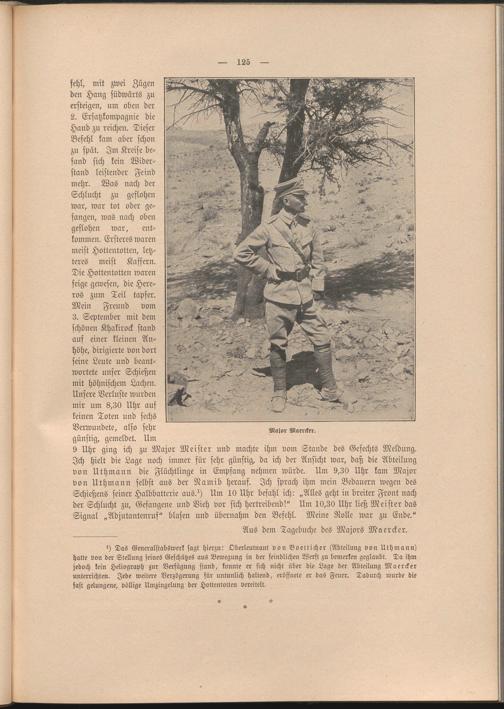 9 Uhr ging ich zu Major Meister und machte ihm vom Stande des Gefechts Meldung. Ich hielt die Lage noch immer für sehr günstig, da ich der Ansicht war, daß die Abteilung von Uthmann die Flüchtlinge in Empfang nehmen würde. Um 9,30 Uhr kam Major von Uthmann selbst aus der Namib herauf. Ich sprach ihm mein Bedauern wegen des Schießens seiner Halbbatterie aus?) Um 10 Uhr befahl ich: „Alles geht in breiter Front nach der Schlucht zu, Gefangene und Vieh vor sich hertreibend!" Um 10,30 Uhr ließ Meister das Signal „Adjutantenruf" blasen und übernahm den Befehl. Meine Rolle war zu Ende."