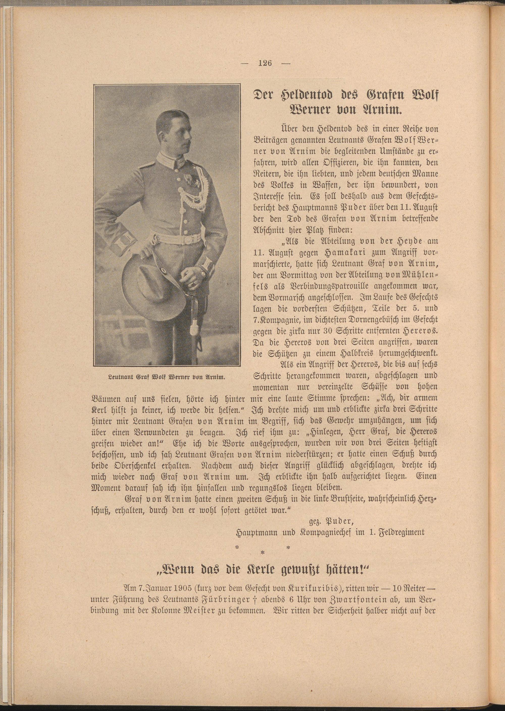 Als ein Angriff der Hereros, die bis auf sechs Schritte herangekommen waren, abgeschlagen und momentan nur vereinzelte Schüsse von hohen Bäumen auf uns fielen, hörte ich hinter mir eine laute Stimme sprechen: „Ach, dir armem Kerl hilft ja keiner, ich werde dir helfen." Ich drehte mich um und erblickte zirka drei Schritte hinter mir Leutnant Grafen von Arnim im Begriff, sich das Gewehr umzuhängen, um sich über einen Verwundeten zu beugen. Ich rief ihm zu: „Hinlegen, Herr Graf, die Hereros greifen wieder an!" Ehe ich die Worte ausgesprochen, wurden wir von drei Seiten heftigst beschossen, und ich sah Leutnant Grafen von Arnim niederstürzen; er hatte einen Schuß durch beide Oberschenkel erhalten. Nachdem auch dieser Angriff glücklich abgeschlagen, drehte ich mich wieder nach Graf von Arnim um. Ich erblickte ihn halb aufgerichtet liegen. Einen Moment darauf sah ich ihn hinfallen und regungslos liegen bleiben.