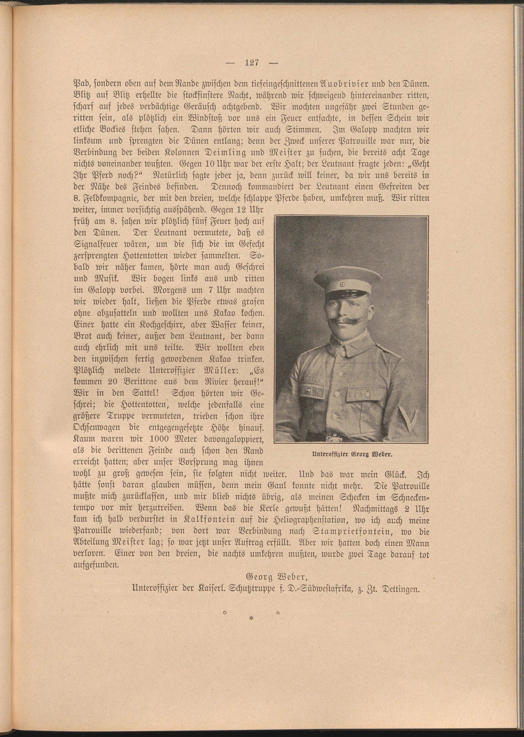 Pad, sondern oben auf dem Rande zwischen dem tiefeingeschnittenen Auobrivier und den Dünen. Blitz auf Blitz erhellte die stockfinstere Nacht, während wir schweigend hintereinander ritten, scharf auf jedes verdächtige Geräusch achtgebend. Wir mochten ungefähr zwei Stunden geritten sein, als plötzlich ein Windstoß vor uns ein Feuer entfachte, in dessen Schein wir etliche Bockies stehen sahen. Dann hörten wir auch Stimmen. Im Galopp machten wir linksum und sprengten die Dünen entlang; denn der Zweck unserer Patrouille war nur, die Verbindung der beiden Kolonnen Deimling und Meister zu suchen, die bereits acht Tage nichts voneinander wußten. Gegen 10 Uhr war der erste Halt; der Leutnant fragte jeden: „Geht Ihr Pferd noch?" Natürlich sagte jeder ja, denn zurück will keiner, da wir uns bereits in der Nähe des Feindes befinden. Dennoch kommandiert der Leutnant einen Gefreiten der 8. Feldkompagnie, der mit den dreien, welche schlappe Pferde haben, umkehren muß. Wir ritten Weiter, immer vorsichtig ausspähend. Gegen 12 Uhr früh am 8. sahen wir plötzlich fünf Feuer hoch auf den Dünen. Der Leutnant vermutete, daß es Signalfeuer wären, um die sich die im Gefecht zersprengten Hottentotten wieder sammelten. Sobald wir näher kamen, hörte man auch Geschrei und Musik. Wir bogen links aus und ritten im Galopp vorbei. Morgens um 7 Uhr machten wir wieder halt, ließen die Pferde etwas grasen ohne abzusatteln und wollten uns Kakao kochen.