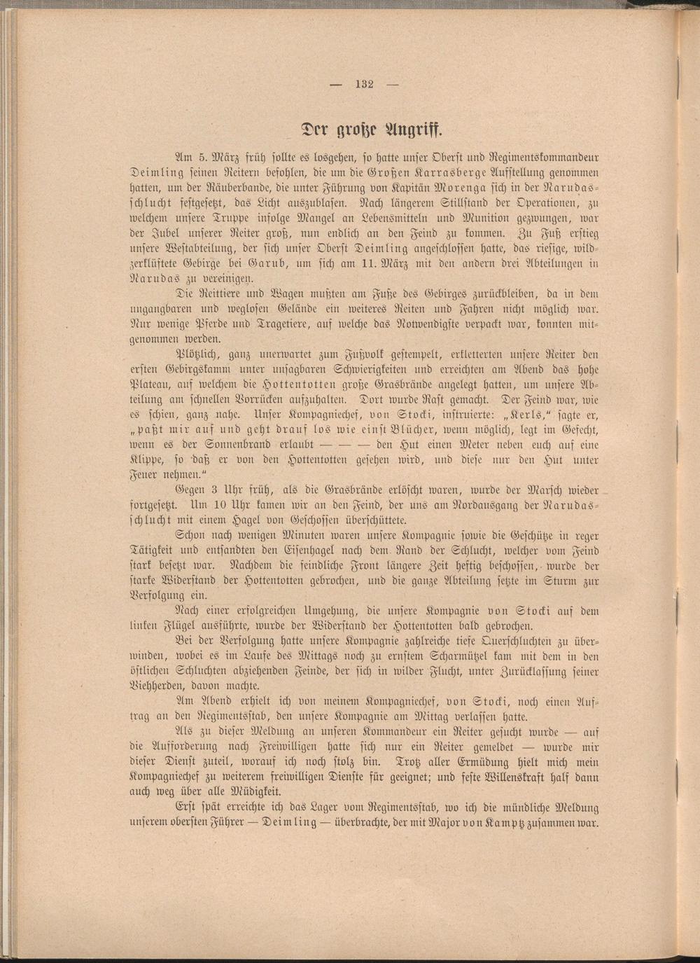 Schon nach wenigen Minuten waren unsere Kompagnie sowie die Geschütze in reger Tätigkeit und entsandten den Eisenhagel nach dem Rand der Schlucht, welcher vom Feind stark besetzt war. Nachdem die feindliche Front längere Zeit heftig beschossen, wurde der starke Widerstand der Hottentotten gebrochen, und die ganze Abteilung setzte im Sturm zur Verfolgung ein.