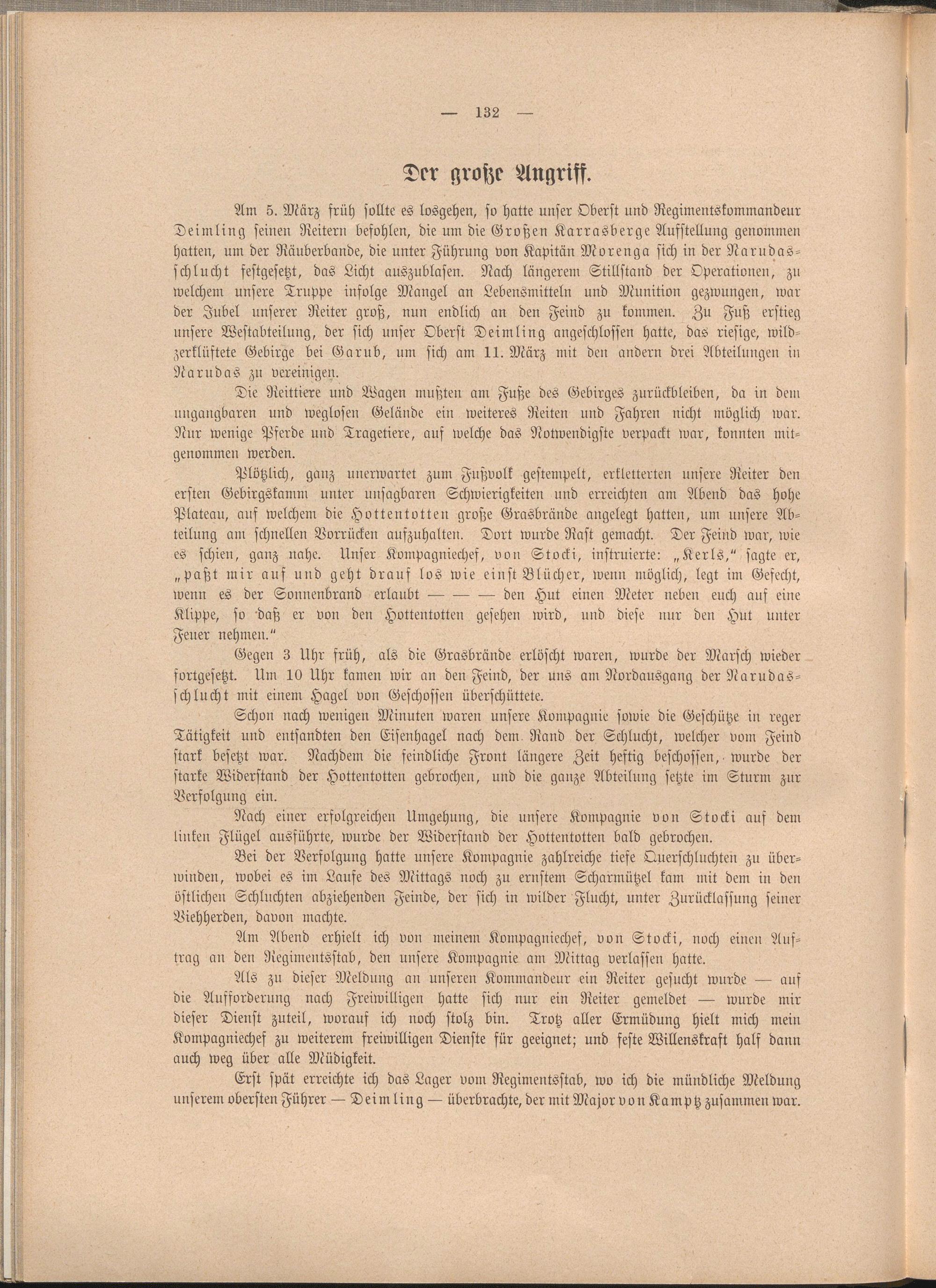 Am 5. März früh sollte es losgehen, so hatte unser Oberst und Regimentskommandeur Deimling seinen Reitern befohlen, die um die Großen Karrasberge Aufstellung genommen hatten, um der Räuberbande, die unter Führung von Kapitän Morenga sich in der Narudas- schlucht festgesetzt, das Licht auszublasen. Nach längerem Stillstand der Operationen, zu welchem unsere Truppe infolge Mangel an Lebensmittelu und Munition gezwungen, war der Jubel unserer Reiter groß, nun endlich an den Feind zu kommen. Zu Fuß erstieg unsere Westabteilung, der sich unser Oberst Deimling angeschlossen hatte, das riesige, wildzerklüftete Gebirge bei Garub, um sich am 11. März mit den andern drei Abteilungen in Narndas zu vereinigen.
