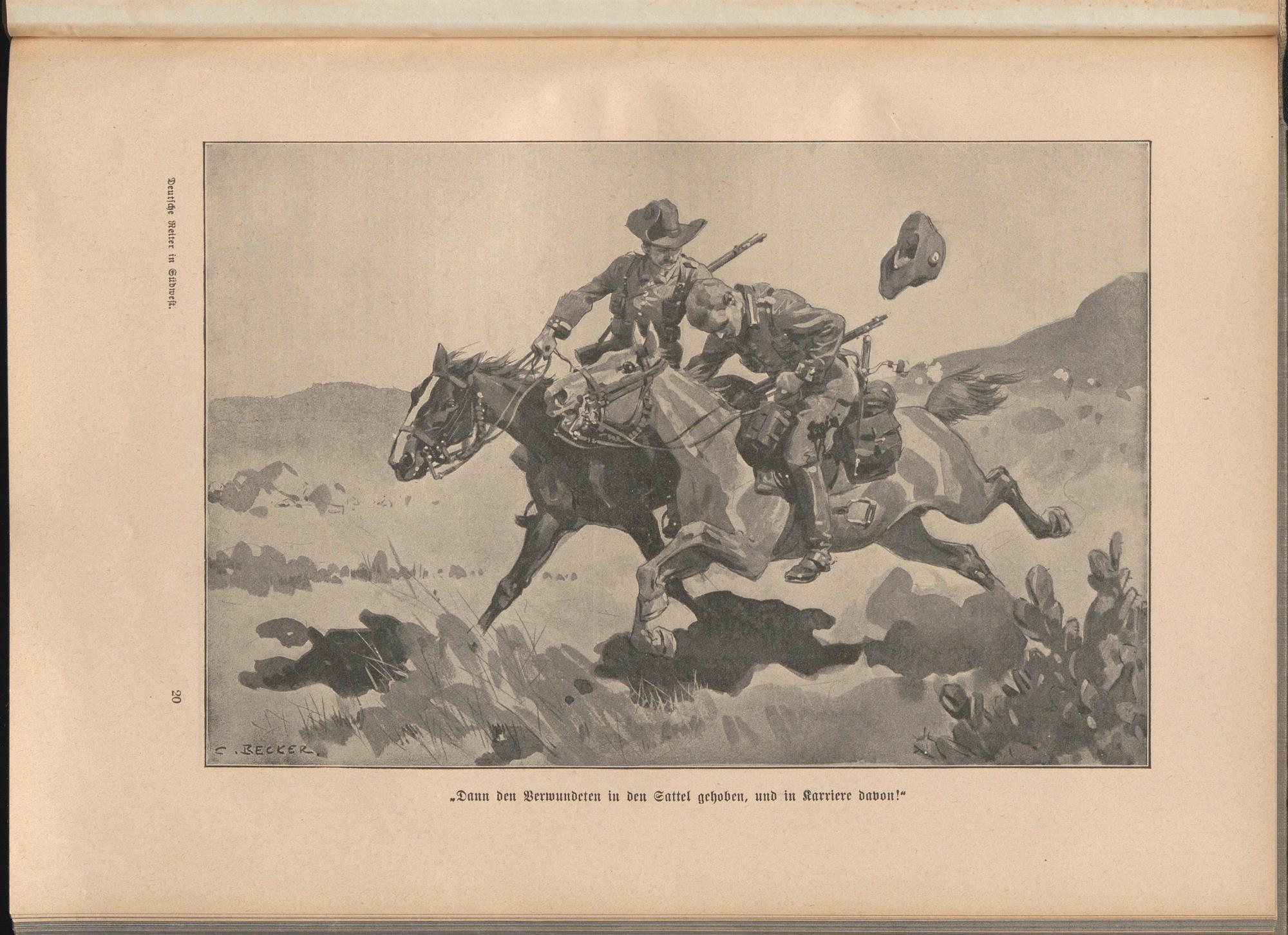 Deutsche Reiter in Südwest. l, S LLc-icenr.- ri"M ' .Dann den Verwundeten in den Sattel gehoben, und in Karriere davon!"