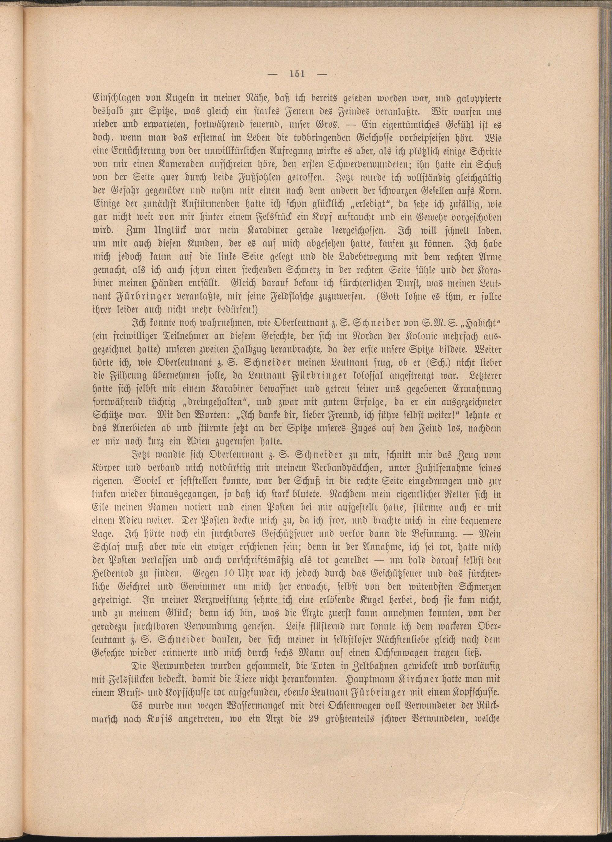Ich konnte noch wahrnehmen, wie Oberleutnant z.S. Schneider von S.M.S. „Habicht" (ein freiwilliger Teilnehmer an diesem Gefechte, der sich im Norden der Kolonie mehrfach ausgezeichnet hatte) unseren zweiten Halbzug heranbrachte, da der erste unsere Spitze bildete. Weiter hörte ich, wie Oberleutnant z. S- Schneider meinen Leutnant frug, ob er (Sch.) nicht lieber die Führung übernehmen solle, da Leutnant Fürbringer kolossal angestrengt war. Letzterer hatte sich selbst mit einem Karabiner bewaffnet und getreu seiner uns gegebenen Ermahnung fortwährend tüchtig „dreingehalten", und zwar mit gutem Erfolge, da er ein ausgezeichneter Schütze war. Mit den Worten: „Ich danke dir, lieber Freund, ich führe selbst weiter!" lehnte er das Anerbieten ab und stürmte jetzt an der Spitze unseres Zuges auf den Feind los, nachdem er mir noch kurz ein Adieu zugerufen hatte.