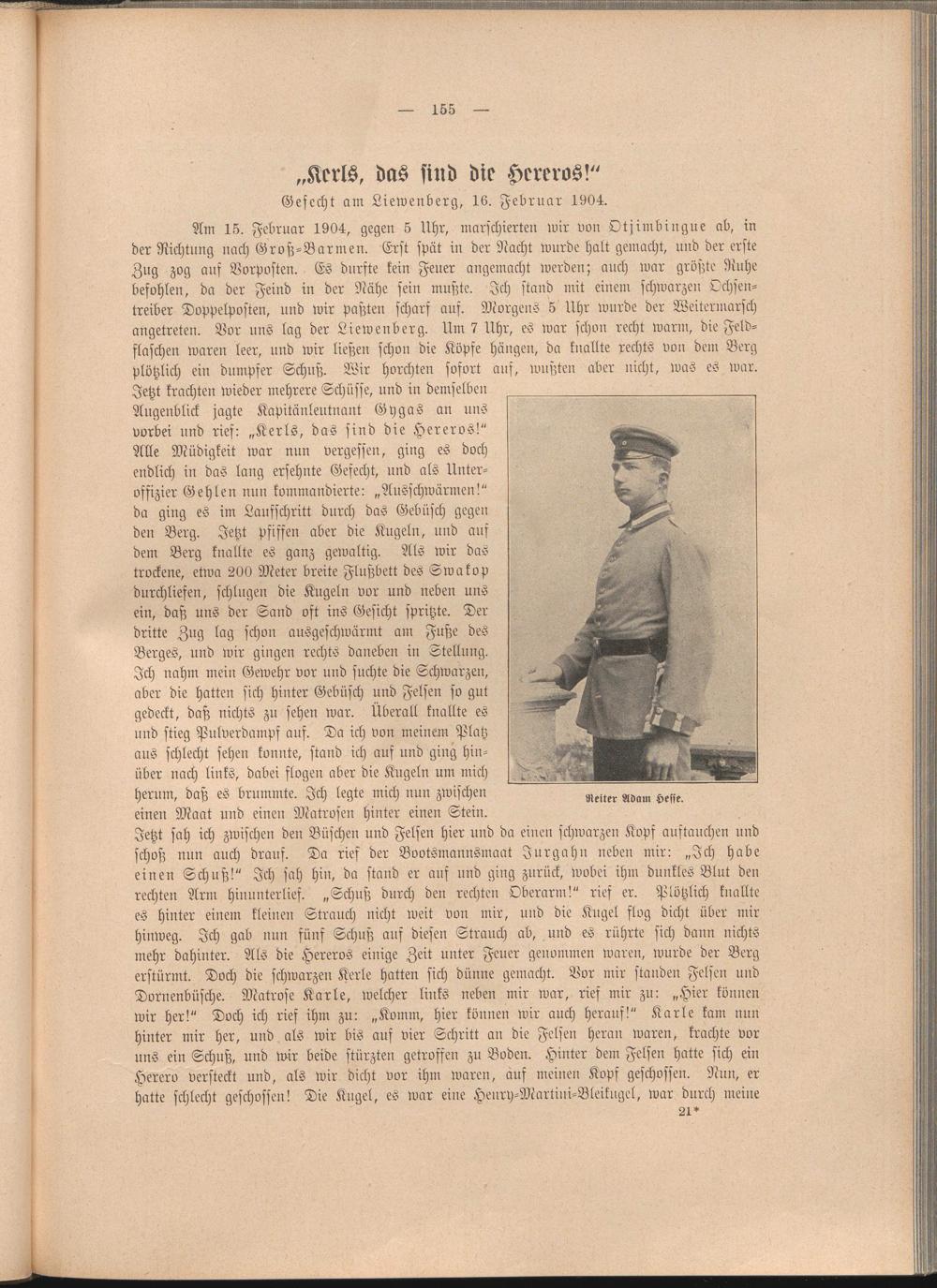 Am 15. Februar 1904, gegen 5 Uhr, marschierten wir von Otjimbingue ab, in der Richtung nach Groß-Barmen. Erst spät in der Nacht wurde halt gemacht, und der erste Zug zog auf Vorposten. Es durfte kein Feuer angemacht werden; auch war größte Ruhe befohlen, da der Feind in der Nähe sein mußte. Ich stand mit einem schwarzen Ochsen- treiber Doppelposten, und wir paßten scharf aus. Morgens 5 Uhr wurde der Weitermarsch angetreten. Bor uns lag der Liewenberg. Um 7 Uhr, es war schon recht warm, die Feldflaschen waren leer, und wir ließen schon die Köpfe hängen, da knallte rechts von dem Berg plötzlich ein dumpfer Schuß. Wir horchten sofort auf, wußten aber nicht, was eS war. Jetzt krachten wieder mehrere Schüsse, und in demselben Augenblick jagte Kapitänleutnant Gygas an uns vorbei und rief: „Kerls, das sind die Hereros!"