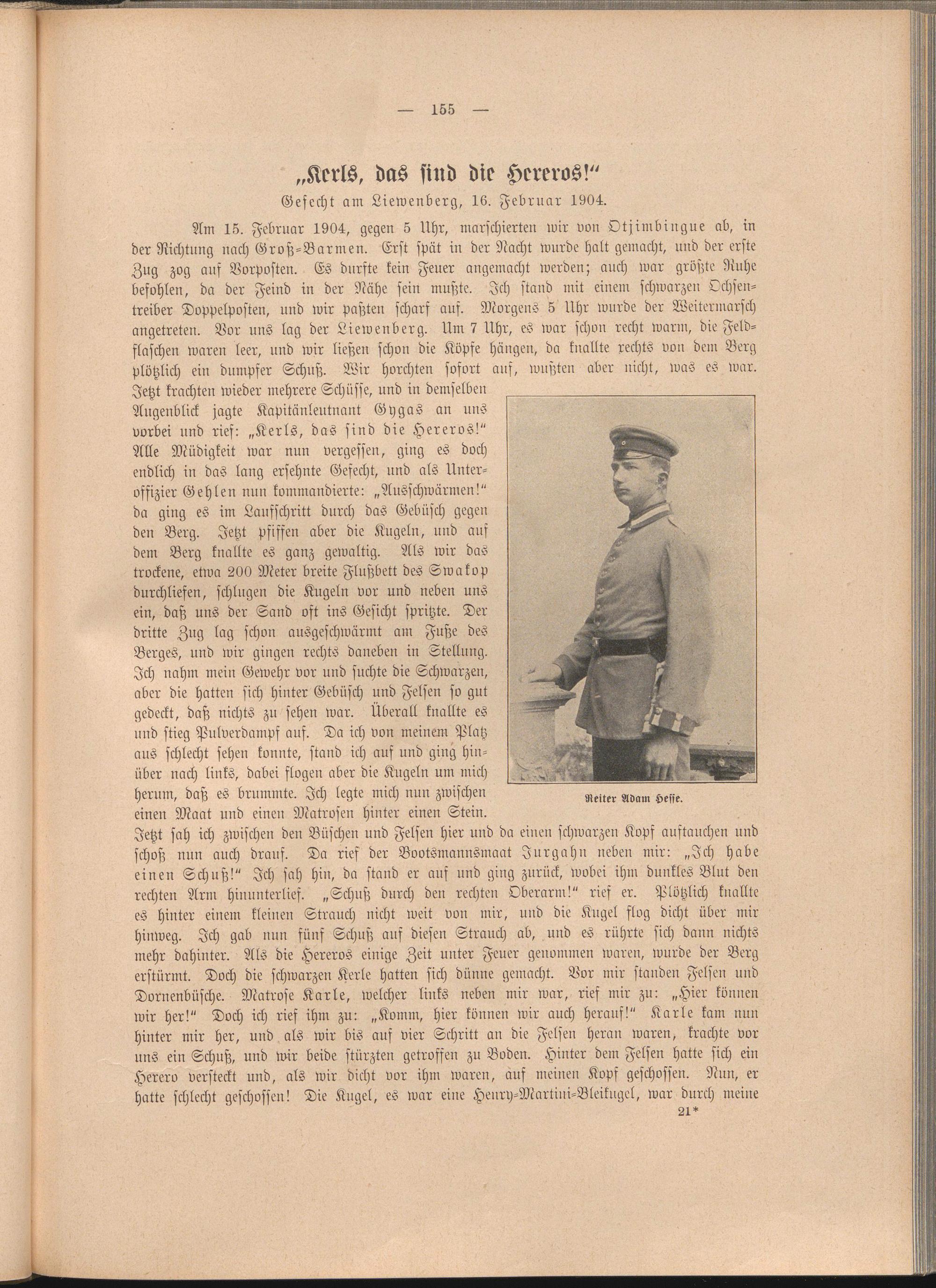 Jetzt sah ich zwischen den Büschen und Felsen hier und da einen schwarzen Kopf auftauchen und schoß nun auch drauf. Da rief der Bootsmannsmaat Jurgahn neben mir: „Ich habe einen Schuß!" Ich sah hin, da stand er auf und ging zurück, wobei ihm dunkles Blut den rechten Arm hinunterlief. „Schuß durch den rechten Oberarm!" rief er. Plötzlich knallte es hinter einem kleinen Strauch nicht weit von mir, und die Kugel flog dicht über mir hinweg. Ich gab nun fünf Schuß auf diesen Strauch ab, und es rührte sich dann nichts mehr dahinter. Als die Hereros einige Zeit unter Feuer genommen waren, wurde der Berg erstürmt. Doch die schwarzen Kerle hatten sich dünne gemacht. Bor mir standen Felsen und Dornenbüsche. Matrose Karle, welcher links neben mir war, rief mir zu: „Hier können wir her!" Doch ich rief ihm zu: „Komm, hier können wir auch herauf!" Karle kam nun hinter mir her, und als wir bis auf vier Schritt an die Felsen heran waren, krachte vor uns ein Schuß, und wir beide stürzten getroffen zu Boden. Hinter dein Felsen hatte sich ein Herero versteckt und, als wir dicht vor ihm waren, auf meinen Kopf geschossen. Nun, er hatte schlecht geschossen! Die Kugel, es war eine Henry-Martiui-Bleikugcl, war durch meine