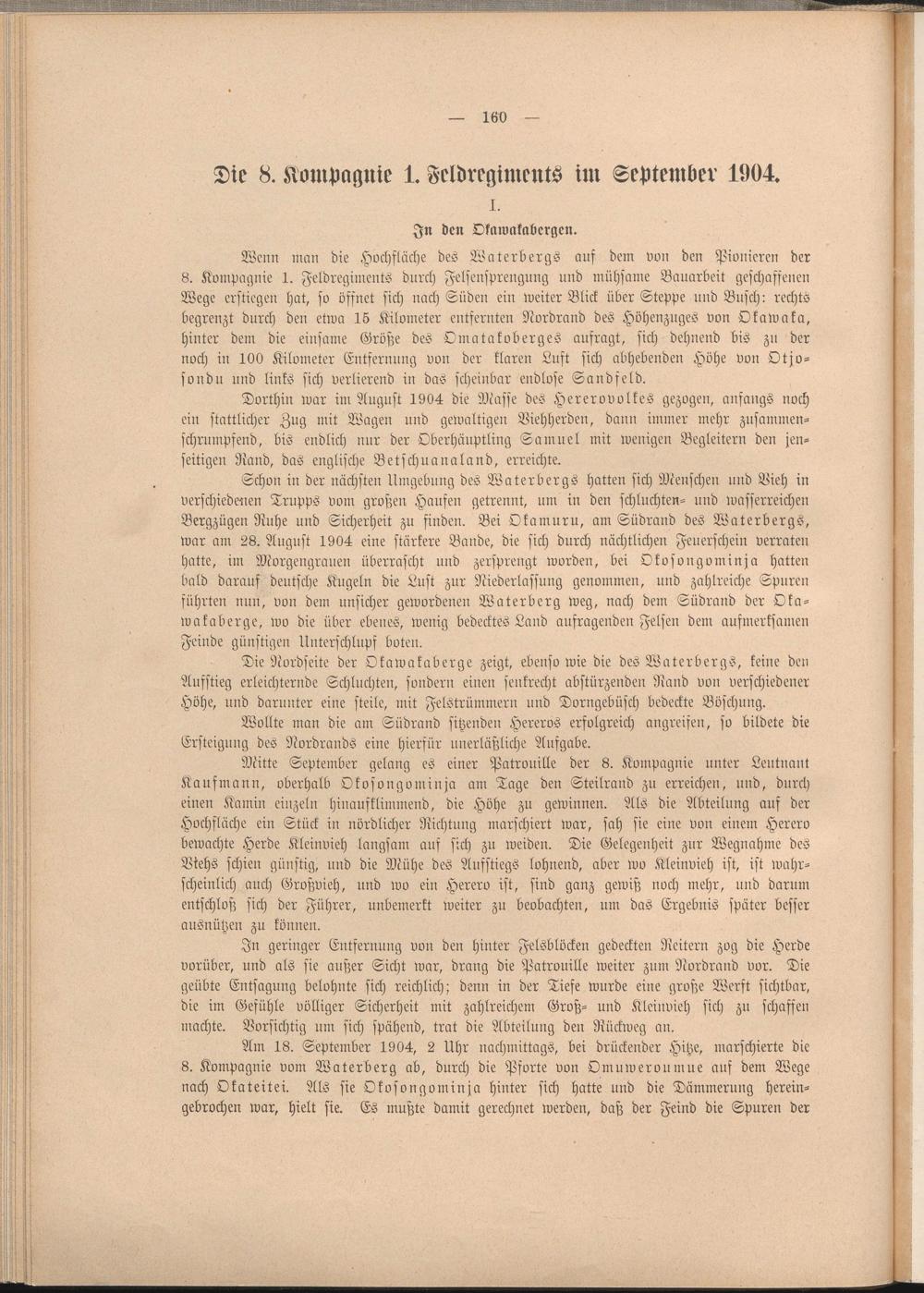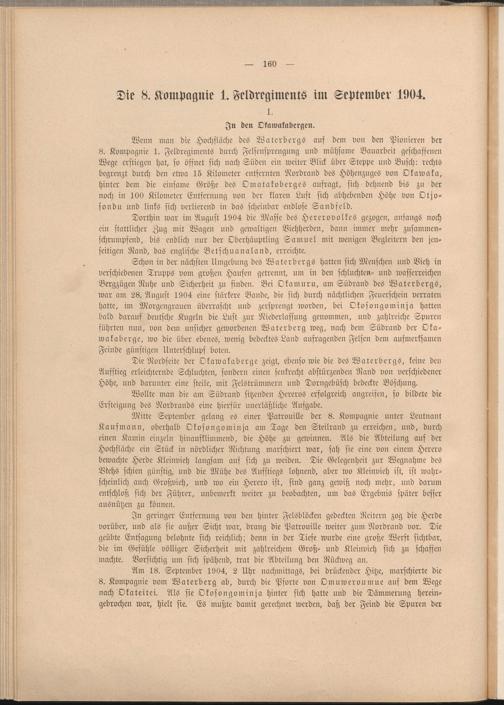 Wenn man die Hochfläche des Waterbergs auf dem von den Pionieren der 8. Kompagnie 1. Feldregiments durch Felsensprengung und mühsame Bauarbeit geschaffenen Wege erstiegen hat, so öffnet sich nach Süden ein weiter Blick über Steppe und Busch: rechts begrenzt durch den etwa 15 Kilometer entfernten Nordrand des Höhenznges von Okawaka, hinter dem die einsame Größe des Omatakoberges aufragt, sich dehnend bis zu der noch in 100 Kilometer Entfernung von der klaren Luft sich abhebenden Höhe von Otjo- sondu und links sich verlierend in das scheinbar endlose Sandfeld.