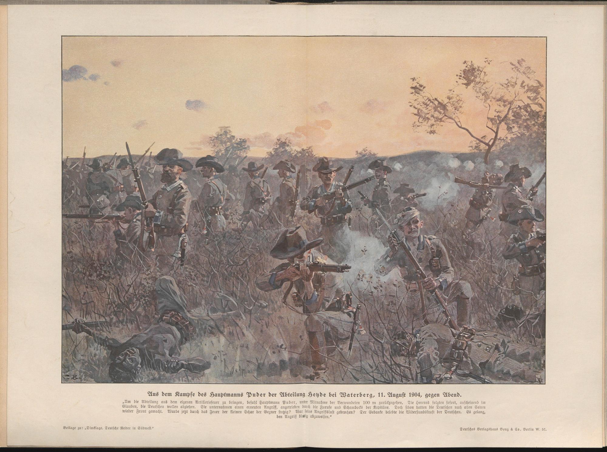 „Um die Abteilung aus dem eigenen Arüllcriefeuer zu bringen, befahl Hauptmann Puder, unter Mitnahme der Verwundeten lOO in zurückzugehen. Die Hcrcros folgten sofort, anscheinend im Glauben, die Deutschen wollen abziehen. Sie unternahmen einen erneuten Angriff, angetrieben durch die Zurufe und Schambocks der Kapitäne. Doch schon hatten die Deutschen nach allen Seiten wieder Front gemacht. Wurde jetzt durch das Feuer der kleinen Schar der Gegner stutzig? War seine Angriffslust gebrochen? Der Gedanke belebte die Widerstandskraft der Deutschen. Es gelang,