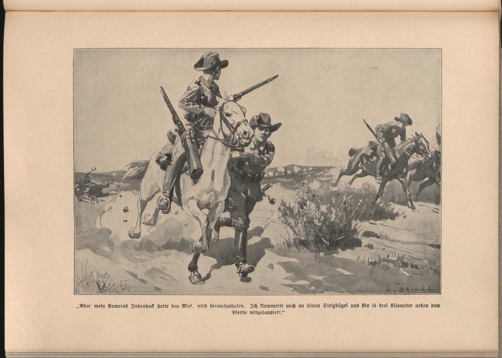 Aber mein Kamerad Indenhock hatte den Mnt. mich bernuszubolen. Ich klammerte mich an seinen Steigbügel und bin sä drei Kilometer neben dem