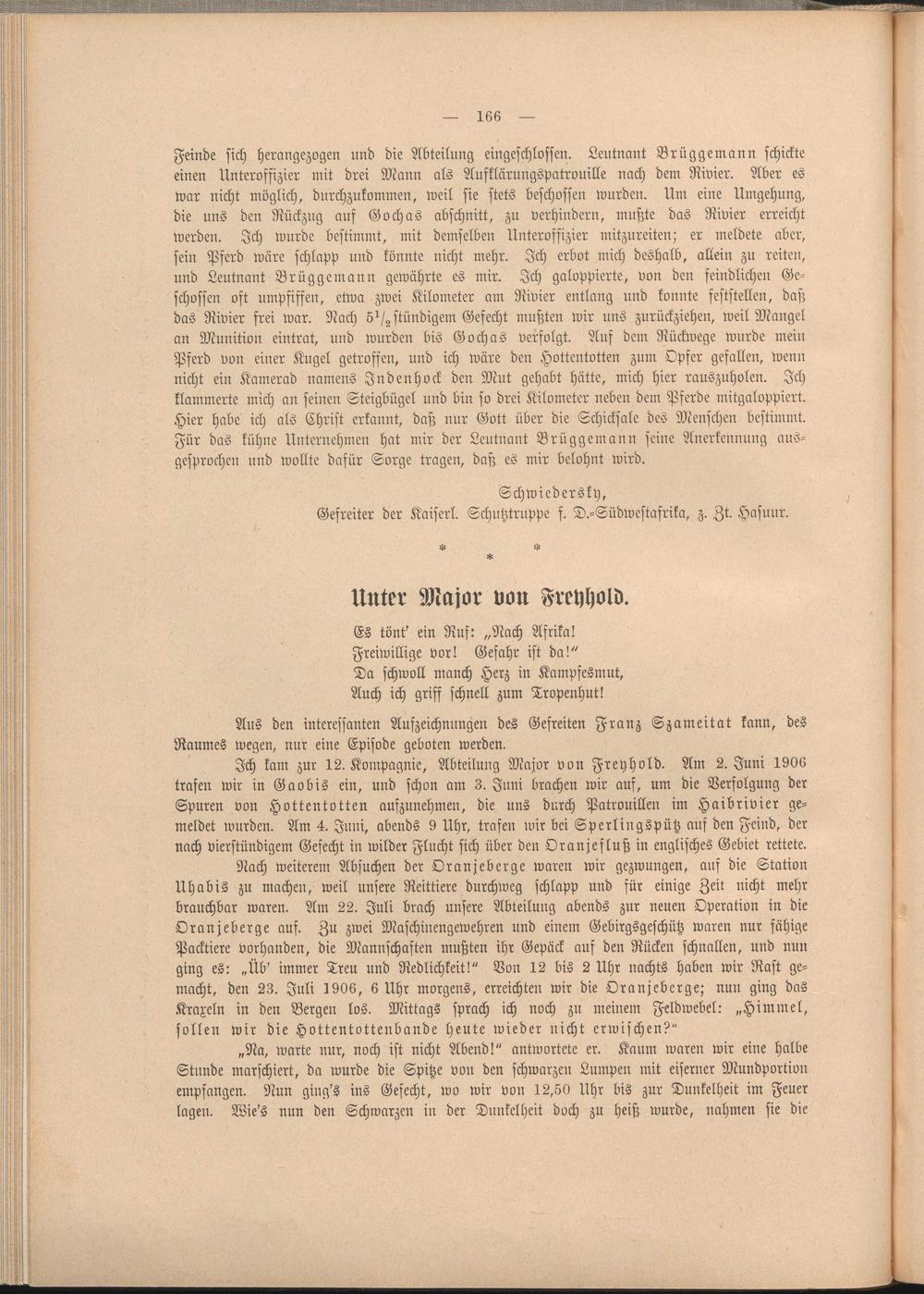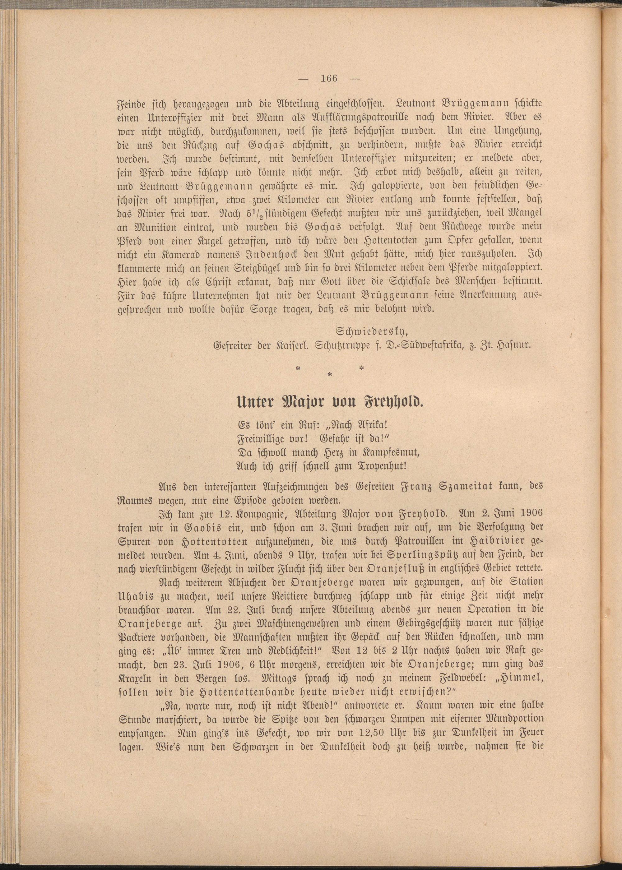 Feinde sich herangezogen und die Abteilung eingeschlossen. Leutnant Brüggemann schickte einen Unteroffizier mit drei Mann als Aufklärungspatrouille nach dem Rivier. Aber es war nicht möglich, durchzukommen, weil sie stets beschossen wurden. Um eine Umgehung, die uns den Rückzug auf Gochas abschnitt, zu verhindern, mußte das Rivier erreicht werden. Ich wurde bestimmt, mit demselben Unteroffizier mitzureiten; er meldete aber, sein Pferd wäre schlapp und könnte nicht mehr. Ich erbot mich deshalb, allein zu reiteu, und Leutnant Brüggemann gewährte es mir. Ich galoppierte, von den feindlichen Geschossen oft umpfiffen, etwa zwei Kilometer am Rivier entlang und konnte feststellen, das; das Rivier frei war. Nach ständigem Gefecht mußten wir uns zurückziehen, weil Mangel an Munition eintrat, und wurden bis Gochas verfolgt. Auf dem Rückwege wurde mein Pferd von einer Kugel getroffen, und ich wäre den Hottentotten zum Opfer gefallen, wenn nicht ein Kamerad namens Jndenhock den Mut gehabt hätte, mich hier rauszuholen. Ich klammerte mich an seinen Steigbügel und bin so drei Kilometer neben dem Pferde mitgaloppiert. Hier habe ich als Christ erkannt, daß nur Gott über die Schicksale des Menschen bestimmt. Für das kühne Unternehmen hat mir der Leutnant Brüggemann seine Anerkennung ausgesprochen und wollte dafür Sorge tragen, daß es mir belohnt wird.