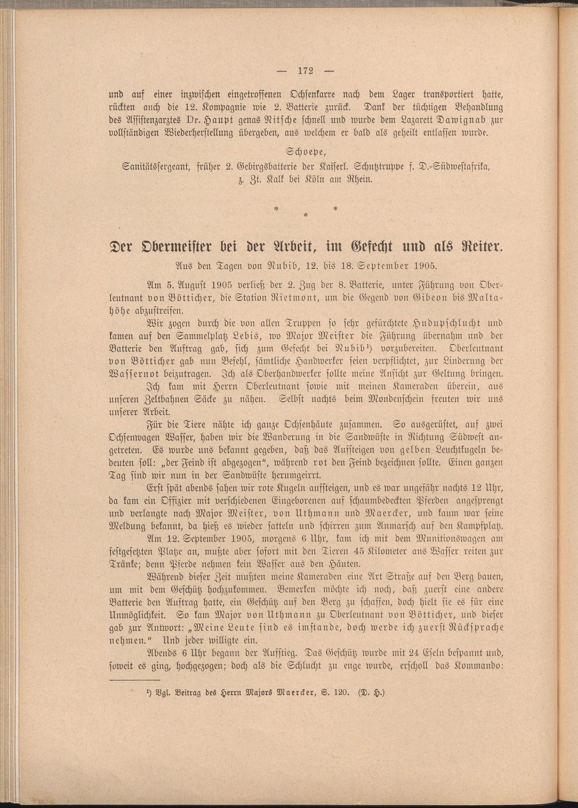 Wir zogen durch die von allen Truppen so sehr gefürchtete Hudupschlucht und kamen auf den Sammelplatz Lebis, wo Major Meister die Führung übernahm und der Batterie den Auftrag gab, sich zum Gefecht bei Nubib st vorzubereiten. Oberleutnant von Bötticher gab nun Befehl, sämtliche Handwerker seien verpflichtet, zur Linderung der Wassernot beizutragen. Ich als Oberhandwerker sollte meine Ansicht zur Geltung bringen.