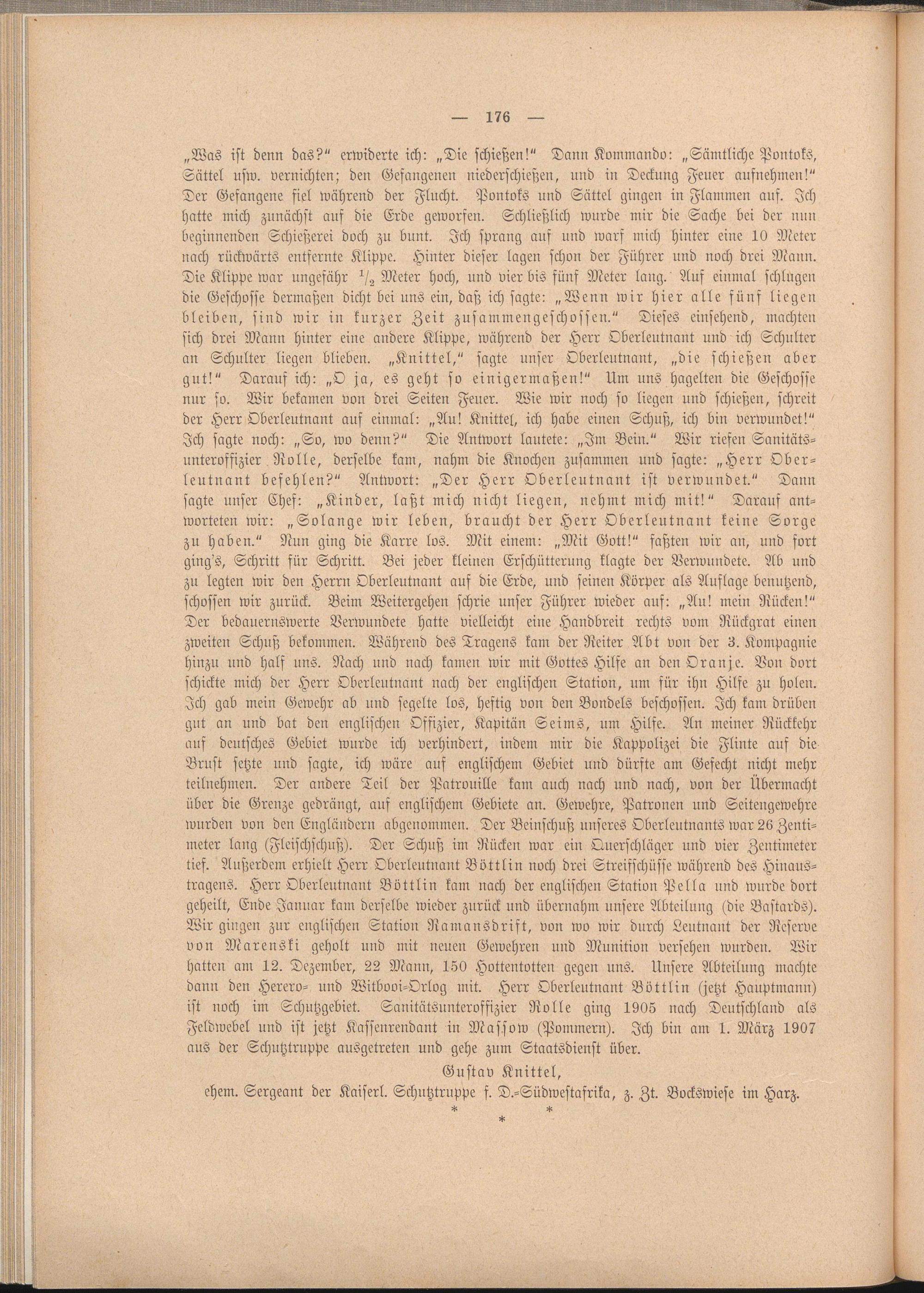„Was ist denn das?" erwiderte ich: „Die schießen!" Dann Kommando: „Sämtliche Pontoks, Sättel usw. vernichten; den Gefangenen niederschießen, und in Deckung Feuer aufnehmen!" Der Gefangene fiel während der Flucht. Pontoks und Sättel gingen in Flammen auf. Ich hatte mich zunächst auf die Erde geworfen. Schließlich wurde mir die Sache bei der nun beginnenden Schießerei doch zu bunt. Ich sprang auf und warf mich hinter eine 10 Bieter nach rückwärts entfernte Klippe. Hinter dieser lagen schon der Führer und noch drei Mann. Die Klippe war ungefähr ^ Meter hoch, und vier bis fünf Meter lang. Auf einmal schlugen die Geschosse dermaßen dicht bei uns ein, daß ich sagte: „Wenn wir hier alle fünf liegen bleiben, sind wir in kurzer Zeit zusammengeschossen." Dieses einsehend, machten sich drei Mann hinter eine andere Klippe, während der Herr Oberleutnant und ich Schulter an Schulter liegen blieben. „Knittel," sagte unser Oberleutnant, „die schießen aber gut!" Darauf ich: „O ja, es geht so einigermaßen!" Um uns hagelten die Geschosse nur so. Wir bekamen von drei Seiten Feuer. Wie wir noch so liegen und schießen, schreit der Herr Oberleutnant auf einmal: „Au! Knittel, ich habe einen Schuß, ich bin verwundet!" Ich sagte noch: „So, wo denn?" Die Antwort lautete: „Im Bein." Wir riefen Sanitätsunteroffizier Rolle, derselbe kam, nahm die Knochen zusammen und sagte: „Herr Oberleutnant befehlen?" Antwort: „Der Herr Oberleutnant ist verwundet." Dann sagte unser Chef: „Kinder, laßt mich nicht liegen, nehmt mich mit!" Darauf antworteten wir: „Solange wir leben, braucht der Herr Oberleutnant keine Sorge zu haben." Nun ging die Karre los. Mit einem: „Mit Gott!" faßten wir an, und fort ging's, Schritt für Schritt. Bei jeder kleinen Erschütterung klagte der Verwundete. Ab und zu legten wir den Herrn Oberleutnant auf die Erde, und seinen Körper als Auflage benutzend, schössen wir zurück. Beim Weitergehen schrie unser Führer wieder auf: „Au! mein Rücken!" Der bedauernswerte Verwundete hatte vielleicht eine Handbreit rechts vorn Rückgrat einen zweiten Schuß bekommen. Während des Tragens kam der Reiter Abt von der 3. Kompagnie hinzu und half uns. Nach und nach kamen wir mit Gottes Hilfe an den Oranje. Von dort schickte mich der Herr Oberleutnant nach der englischen Station, um für ihn Hilfe zu holen. Ich gab mein Gewehr ab und segelte los, heftig von den Bondels beschossen. Ich kam drüben gut an und bat den englischen Offizier, Kapitän Seims, um Hilfe. An meiner Rückkehr aus deutsches Gebiet wurde ich verhindert, indem mir die Kappolizei die Flinte auf die Brust setzte und sagte, ich wäre auf englischem Gebiet und dürfte am Gefecht nicht mehr teilnehmen. Der andere Teil der Patrouille kam auch nach und nach, von der Übermacht über die Grenze gedrängt, auf englischem Gebiete an. Gewehre, Patronen und Seitengewehre wurden von den Engländern abgenommen. Der Beinschuß unseres Oberleutnants war 26 Zentimeter lang (Fleischschuß). Der Schuß im Rücken war ein Querschläger und vier Zentimeter tief. Außerdem erhielt Herr Oberleutnant Böttlin noch drei Streifschüsse während des Hinaustragens. Herr Oberleutnant Böttlin kam nach der englischen Station Pella und wurde dort geheilt, Ende Januar kam derselbe wieder zurück und übernahm unsere Abteilung (die Bastards). Wir gingen zur englischen Station Namansdrift, von wo wir durch Leutnant der Reserve von Marenski geholt und mit neuen Gewehren und Munition versehen wurden. Wir hatten am 12. Dezember, 22 Mann, 150 Hottentotten gegen uns. Unsere Abteilung machte dann den Herero- und Witbooi-Orlog mit. Herr Oberleutnant Böttlin (jetzt Hauptmann) ist noch im Schutzgebiet. Sanitätsunteroffizier Rolle ging 1905 nach Deutschland als Feldwebel und ist jetzt Kassenrendaut in Massow (Pommern). Ich bin am 1. März 1907 aus der Schutztruppe ausgetreten und gehe zum Staatsdienst über.