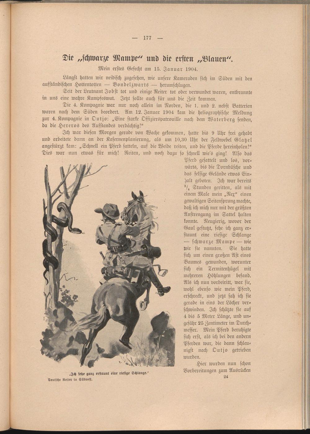 Pferd gesattelt und los, vorwärts, bis die Dornbüsche und das felsige Gelände etwas Einhalt geboten. Ich war bereits ^ Stunden geritten, als mit einen: Male mein „Ncx" einen gewaltigen Seitensprung machte, daß ich mich nur mit der größten Anstrengung im Sattel halten konnte. Neugierig, wovor der Gaul gestutzt, sehe ich ganz erstaunt eine riesige Schlange — schwarze Mampe — wie wir sie nannten. Sie hatte sich um einen großen Ast eines Baumes gewunden, worunter sich ein Termitenhügel mit mehreren Höhlungen befand. Als ich nun vorbeiritt, war sie, wohl ebenso wie mein Pferd, erschreckt, und jetzt sah ich sie gerade in eins der Löcher verschwinden. Ich schätzte sie auf 4 bis 5 Bieter Länge, und ungefähr 25 Zentimeter im Durchmesser. Mein Pferd beruhigte sich erst, als ich bei den andern Pferden war, die dann schleunigst nach Outjo getrieben wurden.