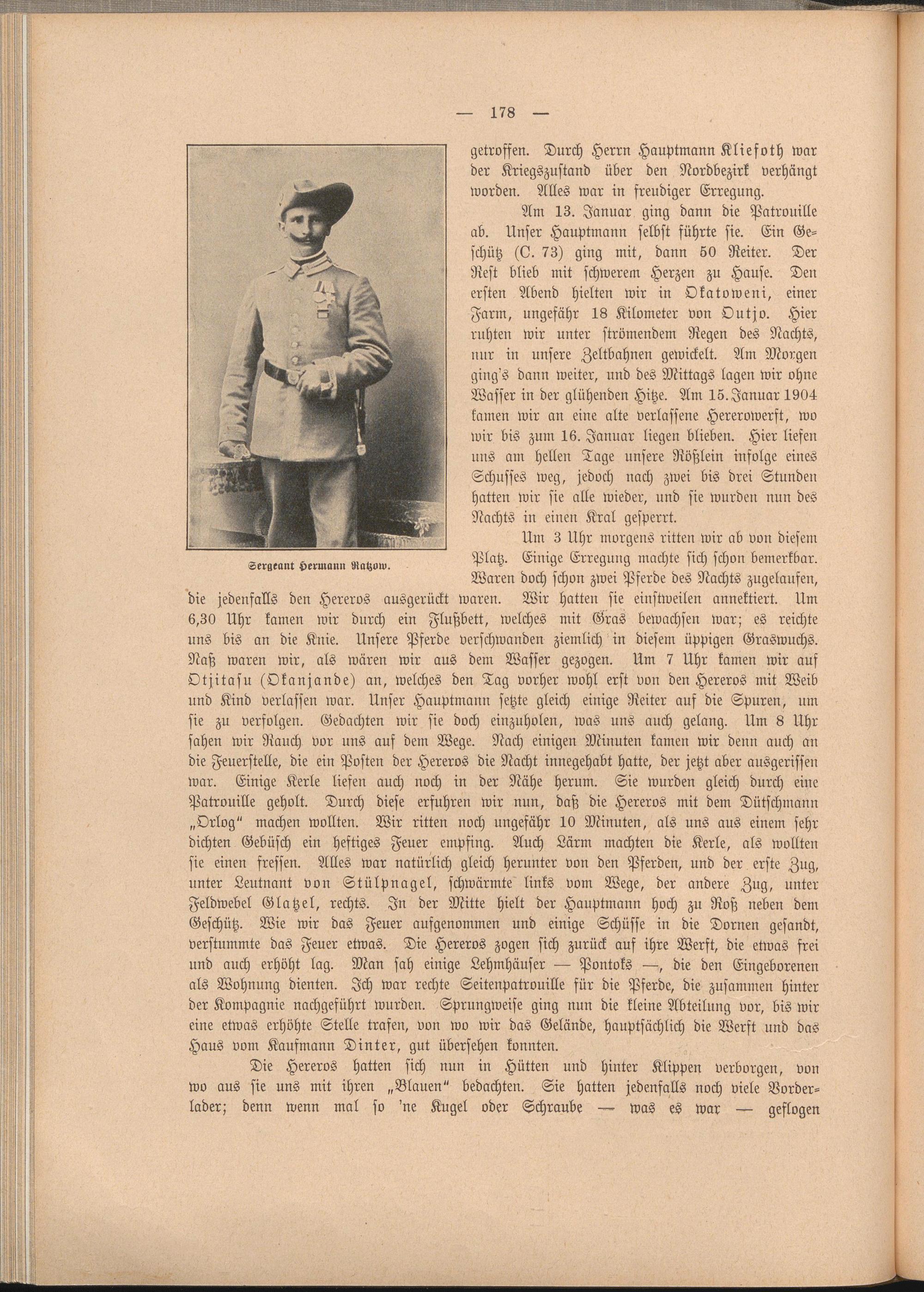 „Orlog" machen wollten. Wir ritten noch ungefähr 10 Minuten, als uns aus einem sehr dichten Gebüsch ein heftiges Feuer empfing. Auch Lärm machten die Kerle, als wollten sie einen fressen. Alles war natürlich gleich herunter von den Pferden, und der erste Zug, unter Leutnant von Stülpnagel, schwärmte links vorn Wege, der andere Zug, unter Feldwebel Glatzel, rechts. In der Mitte hielt der Hauptmann hoch zu Roß neben dem Geschütz. Wie wir das Feuer aufgenommen und einige Schüsse in die Dornen gesandt, verstummte das Feuer etwas. Die Hereros zogen sich zurück auf ihre Werft, die etwas frei und auch erhöht lag. Man sah einige Lehmhäuser — Pontoks —, die den Eingeborenen als Wohnung dienten. Ich war rechte Seitenpatrouille für die Pferde, die zusammen hinter der Kompagnie nachgeführt wurden. Sprungweise ging nun die kleine Abteilung vor, bis wir eine etwas erhöhte Stelle trafen, von wo wir das Gelände, hauptsächlich die Werft und das Haus vom Kaufmann Dinter, gut übersehen konnten.