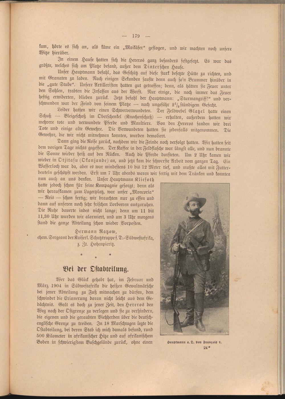 Wer das Glück gehabt hat, im Februar und März 1904 in Südwestafrika die heißen Gewaltmärsche bei jener Abteilung zu Fuß mitmachen zu dürfen, dem schwindet die Erinnerung daran nicht leicht aus dem Gedächtnis. Galt es doch zu jener Zeit, den Hereros den Weg nach der Ostgrenze zu verlegen und sie zu verhindern, die eigenen und die geraubten Viehherden über die deutschenglische Grenze zu treiben. In 18 Marschtagen legte die Ostabteilung, bei deren Stab ich mich damals befand, rund 500 Kilometer in afrikanischer Hitze und auf afrikanischem Boden in schwierigstem Buschgelände zurück, ohne einen