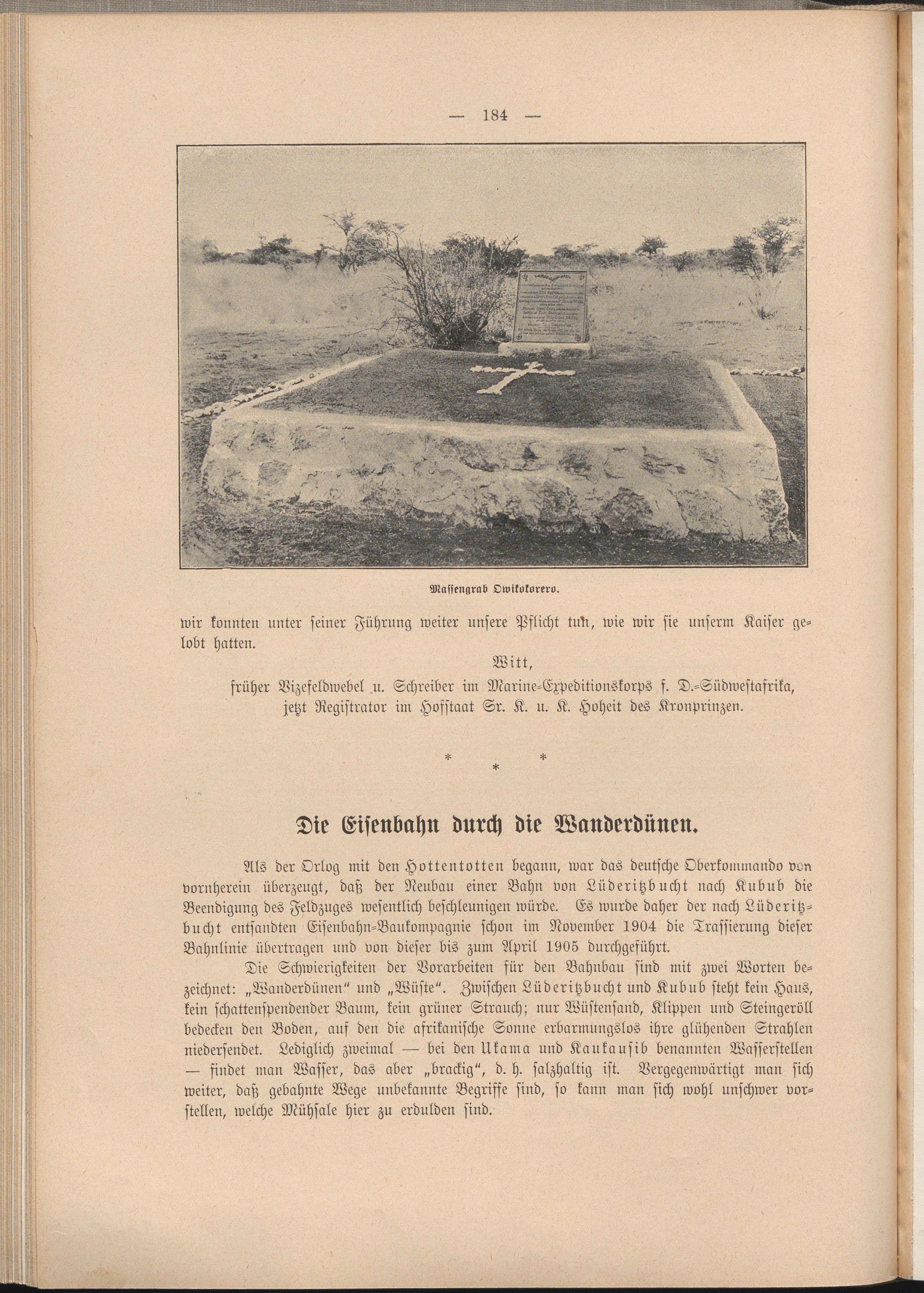 AIs der Orlog mit den Hottentotten begann, war das deutsche Oberkommando von vornherein überzeugt, daß der Neubau einer Bahn von Lüderitzbucht nach Knbub die Beendigung des Feldzuges wesentlich beschleunigen würde. Es wurde daher der nach Lüderitz- bncht entsandten Eisenbahn-Baukompagnie schon im November 1904 die Trassierung dieser Bahnlinie übertragen und von dieser bis zum April 1905 durchgeführt.