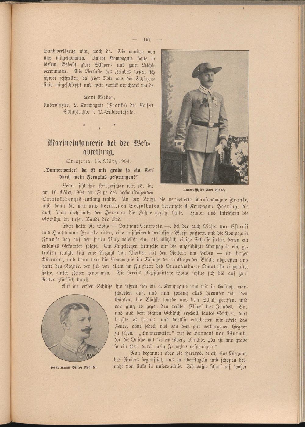 Eben hatte die Spitze — Leutnant Leutwein —, bei der auch Major von Esrorfs und Hauptmann Franke ritten, eine anscheinend verlassene Werft Passiert, und die Kompagnie Franke bog auf den freien Platz daselbst ein, als plötzlich einige Schüsse fielen, denen ein endloses Geknatter folgte. Ein Kugelregen prasselte aus die ungeschützte Kompagnie ein, getroffen wälzte sich eine Anzahl von Pferden mit den Reitern am Boden — ein kurzer Wirrwarr, und dann war die Kompagnie im Schutze der rückliegenden Büsche abgesessen und hatte den Gegner, der sich vor allem im Flußbette des Omuramba-u-Omatako eingenistet hatte, unter Feuer genommen. Die bereits abgeschnittene Spitze schlug sich bis auf zwei Reiter glücklich durch.