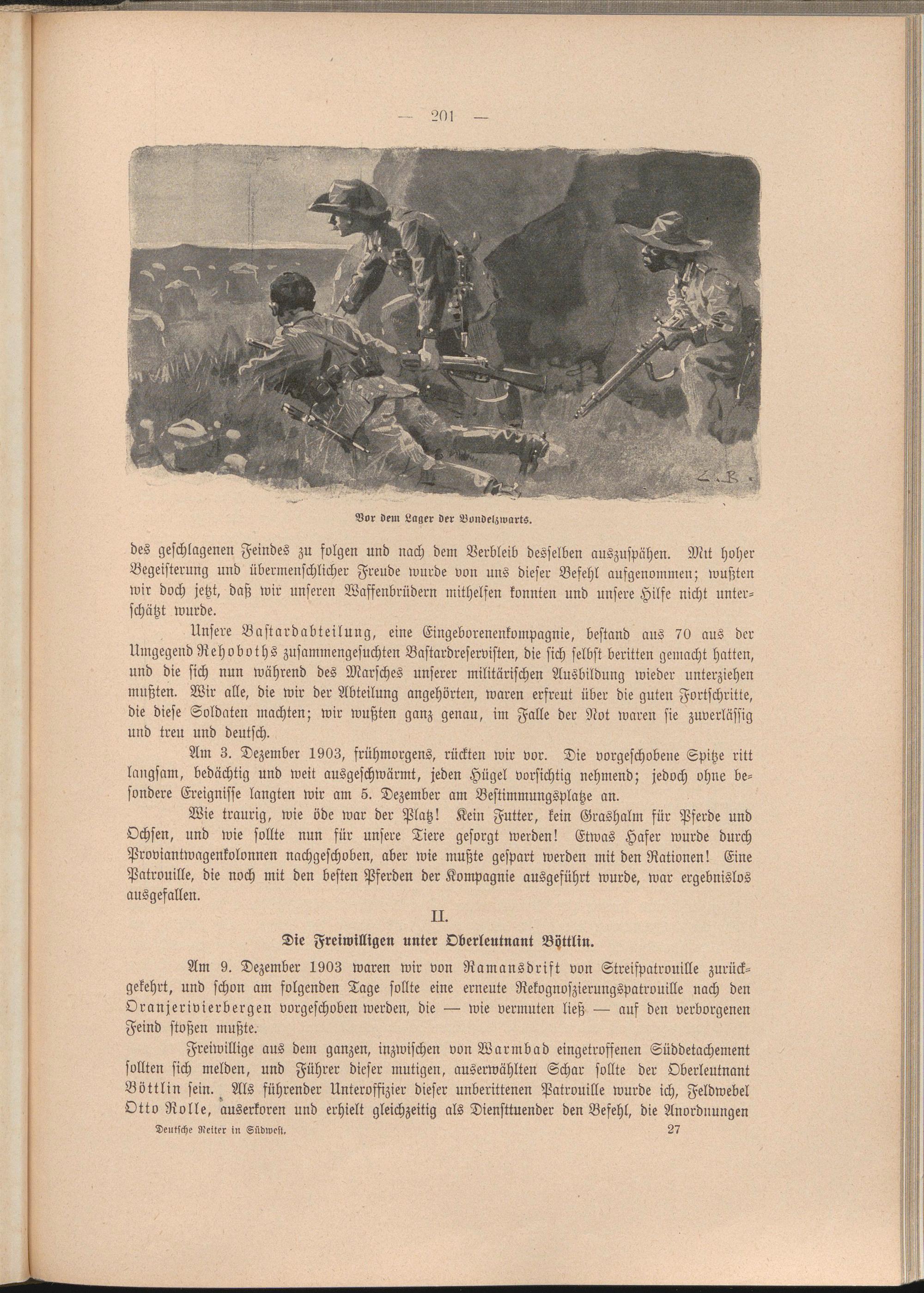 Freiwillige aus dem ganzen, inzwischen von Warmbad eingetroffenen Süddetachement sollten sich melden, und Führer dieser mutigen, auserwählten Schar sollte der Oberleutnant Böttlin sein. Als führender Unteroffizier dieser unberittenen Patrouille wurde ich, Feldwebel Otto Rolle, auserkoren und erhielt gleichzeitig als Diensttuender den Befehl, die Anordnungen