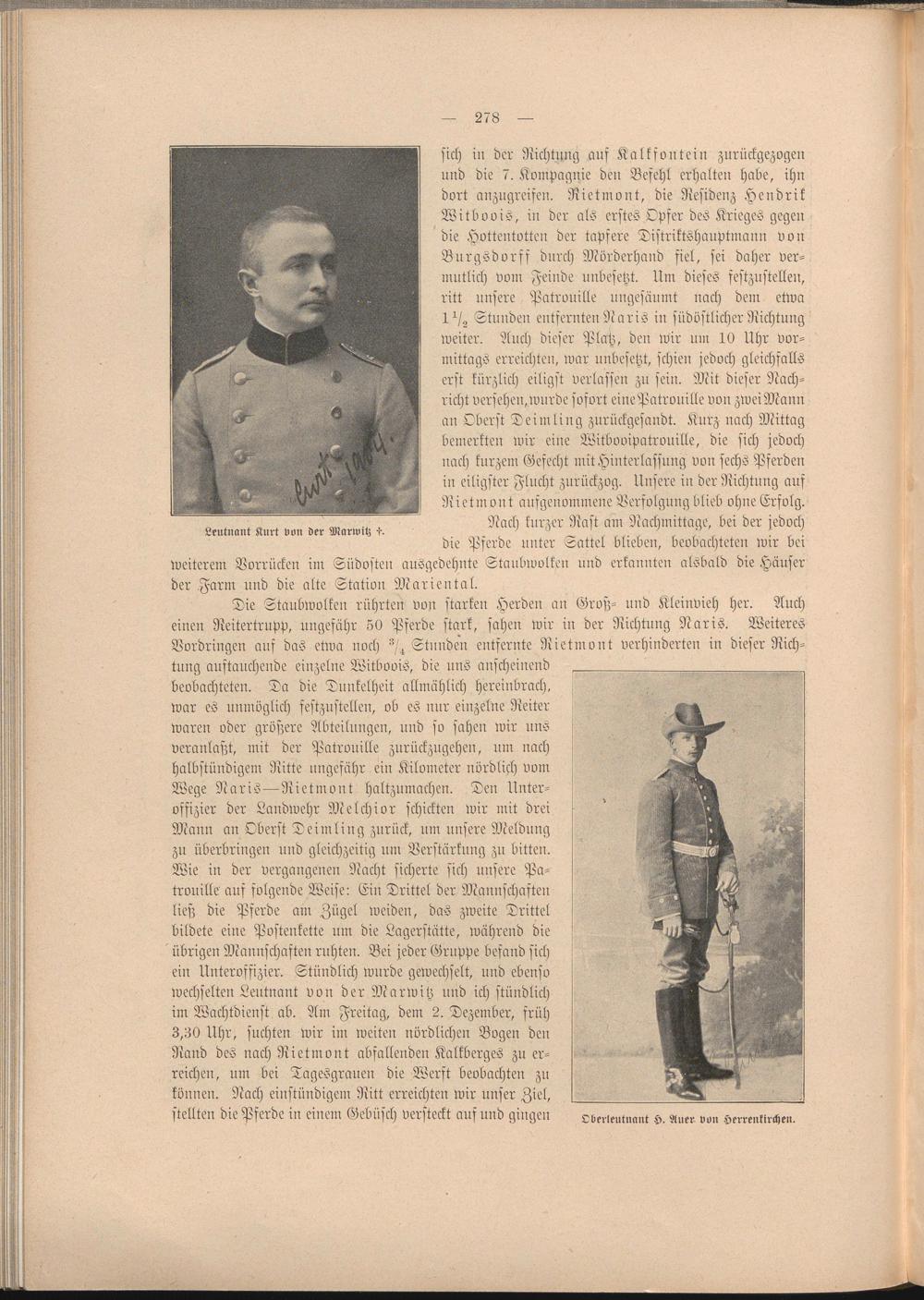 sich in der Richtung aus Kalkfontein zurückgezogen und die 7. Kompagnie den Befehl erhalten habe, ihn dort anzugreifen. Rietmont, die Residenz Hendrik Witboois, in der als erstes Opfer des Krieges gegen die Hottentotten der tapfere Distriktshauptmann von Burgsdorff durch Mörderhand fiel, sei daher vermutlich vom Feinde unbesetzt. Um dieses festzustellen, ritt unsere Patrouille ungesäumt nach dem etwa I sig Stunden entfernten Naris in südöstlicher Richtung weiter. Auch dieser Platz, den wir um 10 Uhr vormittags erreichten, war unbesetzt, schien jedoch gleichfalls erst kürzlich eiligst verlassen zu sein. Mit dieser Nachricht versehen,wurde sofort einePatrouille von zweiMann an Oberst Teimling zurückgesandt. Kurz nach Mittag bemerkten wir eine Witbooipatronille, die sich jedoch nach kurzem Gefecht mit Hinterlassung von sechs Pferden in eiligster Flucht zurückzog. Unsere in der Richtung auf Rietmont aufgenommene Verfolgung blieb ohne Erfolg.
