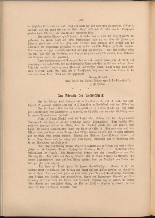 Trotz Entbehrungen und Strapazen hat es mich niemals gereut, daß ich freiwillig mitgegangen bin nach Afrika, für des Vaterlandes Ruhm und Ehre zu kämpfen und zu bluten. Daß wir manchmal tagelang ohne Proviant und Wasser waren, dafür konnte man nicht; denn in diesem Lande ist's nicht wie in Deutschland, daß man von einer Kneipe in die andere wandern kann. Dort war Kriegszustand!