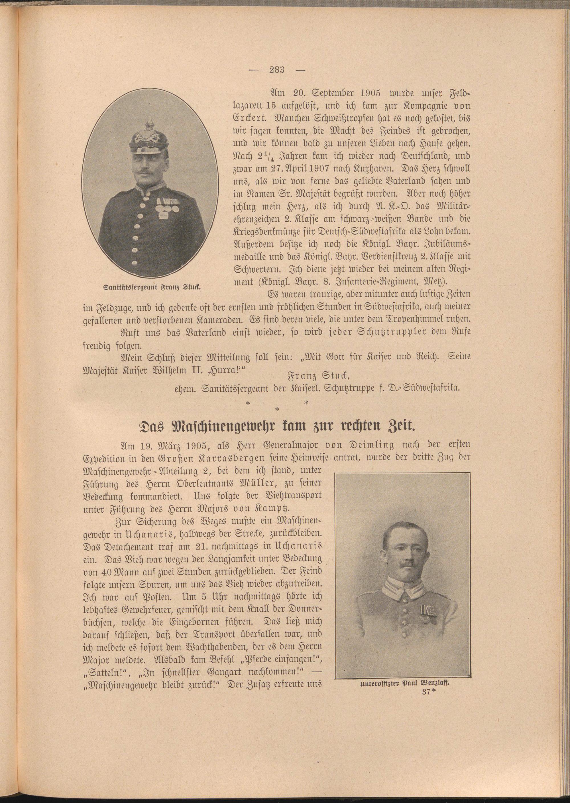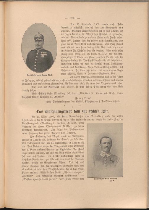 Am 20. September 1905 wurde unser Feldlazarett 15 aufgelöst, und ich kam zur Kompagnie von Erckert. Manchen Schweißtropfen hat es noch gekostet, bis wir sagen konnten, die Macht des Feindes ist gebrochen, und wir können bald zu unseren Lieben nach Hause gehen. Nach 2st^ Jahren kam ich wieder nach Deutschland, und zwar am 27. April 1907 nach Kuxhaven. Das Herz schwoll uns, als wir von ferne das geliebte Vaterland sahen und im Namen Sr. Majestät begrüßt wurden. Aber noch höher schlug mein Herz, als ich durch A. K.-O. das Militärehrenzeichen 2. Klasse am schwarz-weißen Bande und die Kriegsdenkmünze für Deutsch-Südwestafrika als Lohn bekam. Außerdem besitze ich noch die Königl. Bahr. Jubiläumsmedaille und das Königl. Bahr. Verdienstkreuz 2. Klasse mit Schwertern. Ich diene jetzt wieder bei meinem alten Regiment (Königl. Bahr. 8. Infanterie-Regiment, Metz).