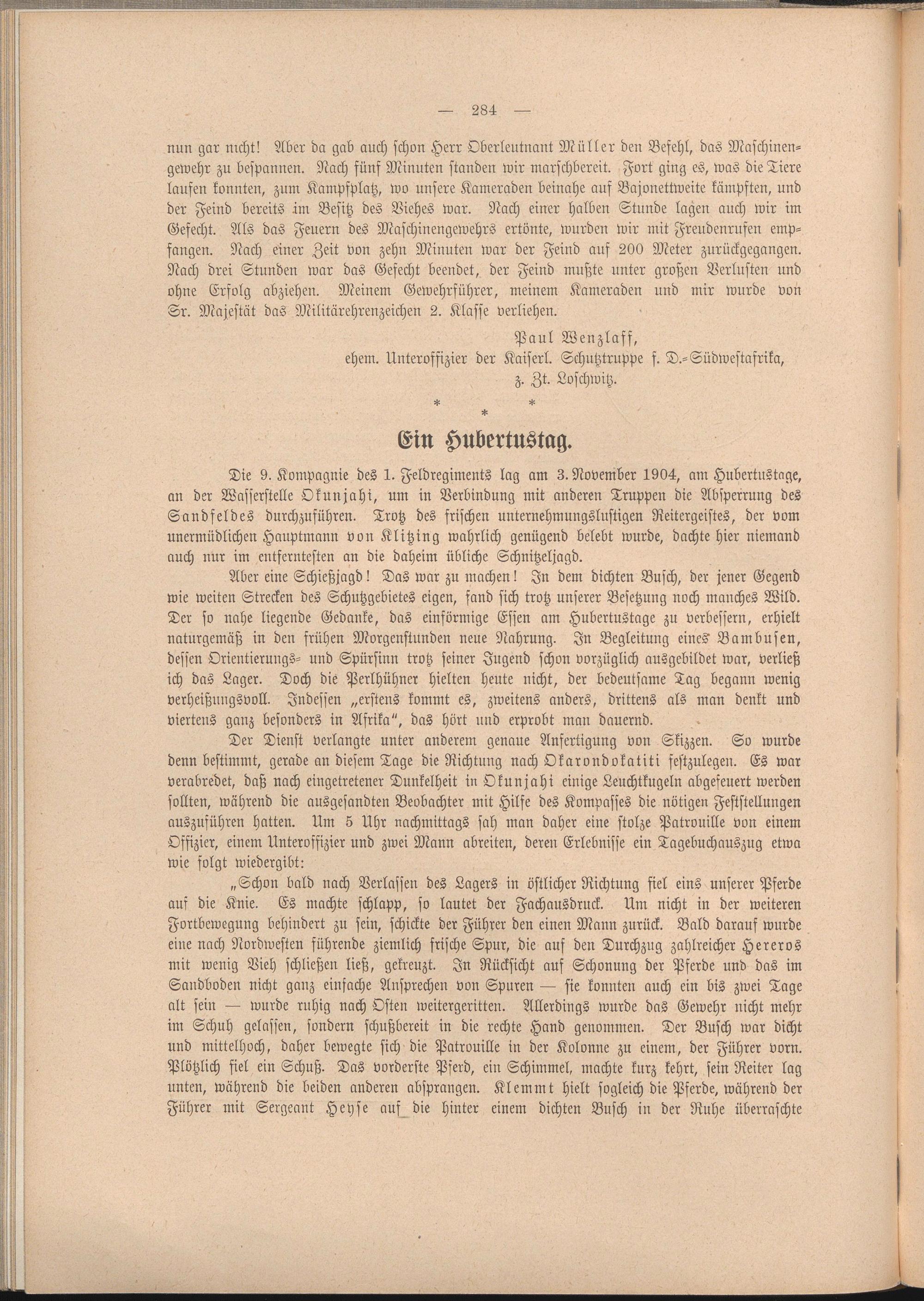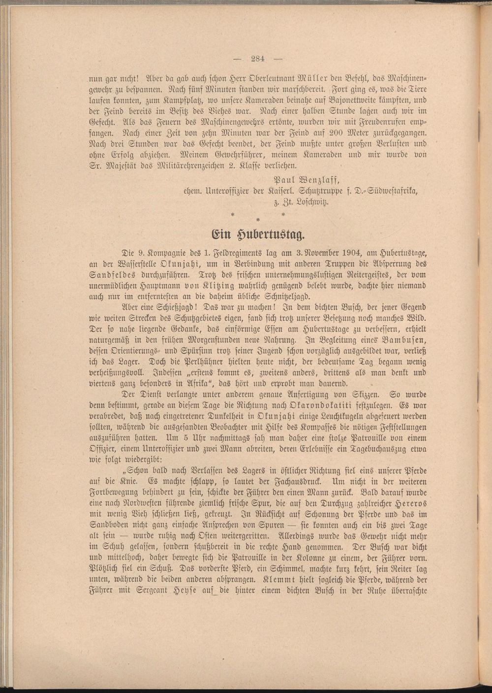 Die 9. Kompagnie des 1. Feldregiments lag am 3. November 1904, am Hubertustage, an der Wasserstelle Okunjahi, um in Verbindung mit anderen Truppen die Absperrung des Sandfeldes durchzuführen. Trotz des frischen unternehmungslustigen Reitergeistes, der vom unermüdlichen Hanptmann von Klitzing wahrlich genügend belebt wurde, dachte hier niemand auch nur im entferntesten an die daheim übliche Schnitzeljagd.