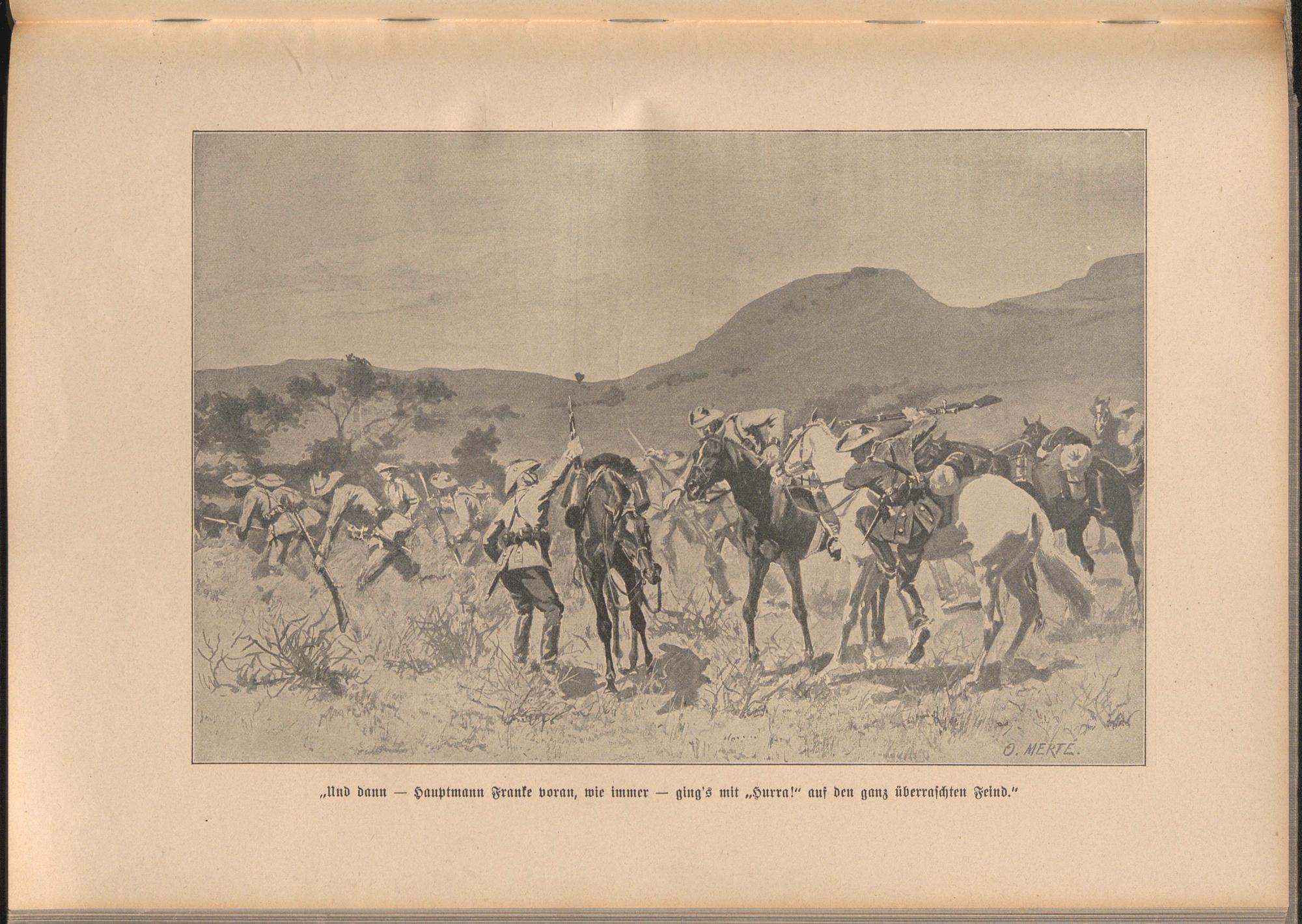 Und dlnm — Hauptmann Franke voran, wie immer — ging's mit „Hurra!" auf den ganz überraschten Feind.