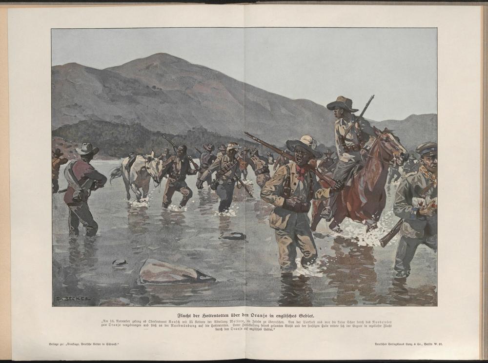 „Am 16. November gelang es Oberleutnant Rausch mit 35 Reitern der Abteilung Moltöre, die Feinde zu überraschen. Von der Tierkluft aus war die kleine Schar durch das Nnvbrivier zum Oranje vorgedrungen und stieß an der Nuobmündung auf die Hottentotten. Unter Zuriiölassung seines gesamten Viehs und der sonstigen Habe rettete sich der Gegner in regelloser Flucht