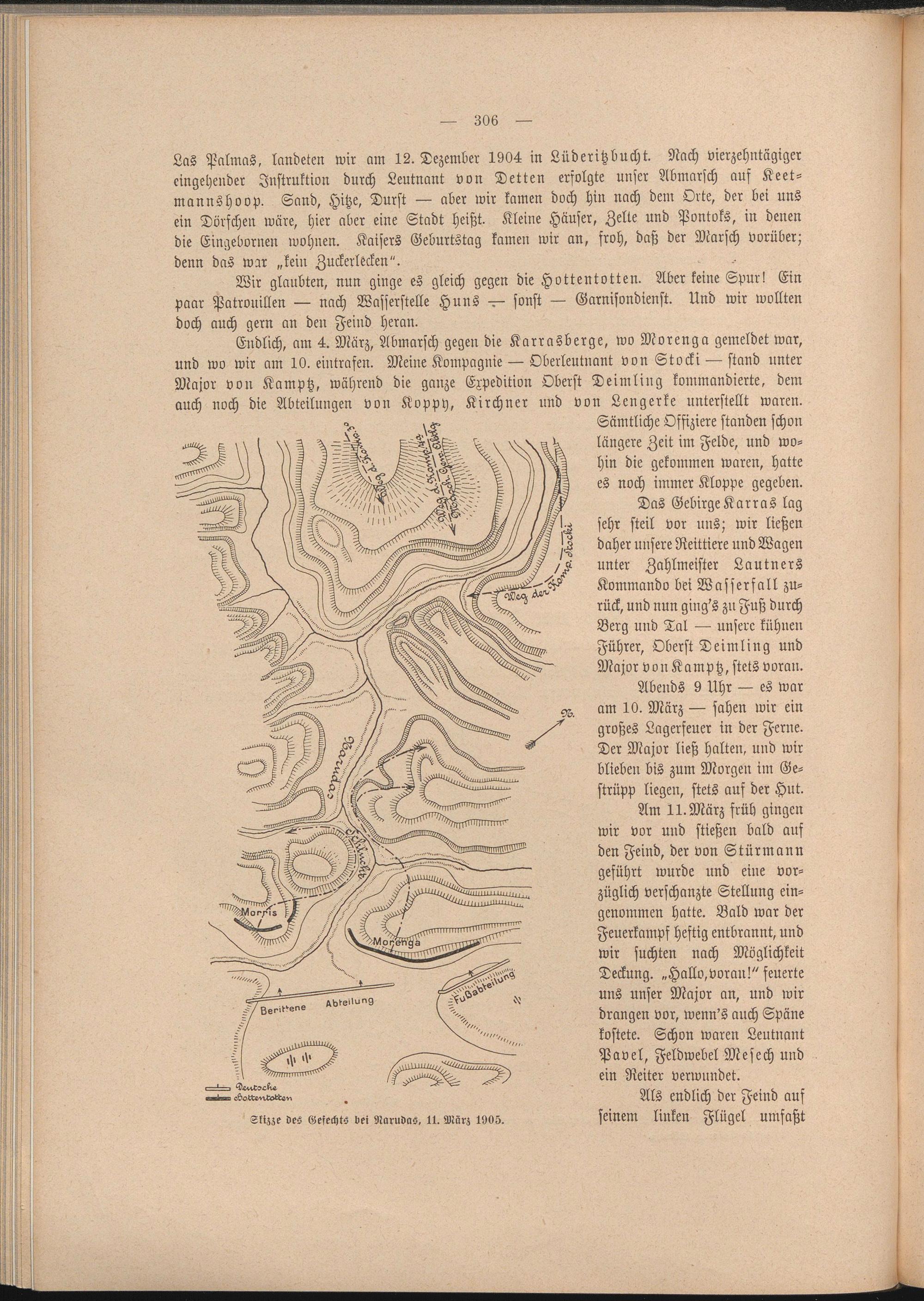 Endlich, am 4. März, Abmarsch gegen die Karrasberge, wo Morenga gemeldet war, und wo wir am 10. eintrafen. Meine Kompagnie — Oberleutnant von Stocki — stand unter Major von Kamptz, während die ganze Expedition Oberst Deimling kommandierte, dem auch noch die Abteilungen von Koppy, Kirchner und von Lengerke unterstellt waren.