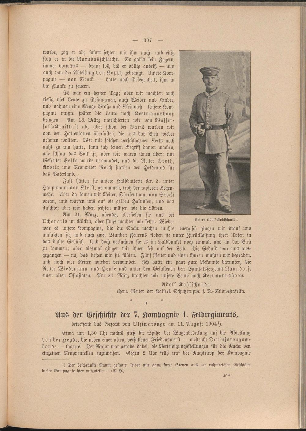 Am 21. März, abends, überfielen sie uns bei Uchanaris im Rücken, aber flugs machten wir kehrt. Wieder war es unsere Kompagnie, die die Sache machen mußte; energisch gingen wir drauf und umfaßten sie, und nach zwei Stunden Feuern» flohen sie unter Zurücklassuug ihrer Toten in das dichte Gebüsch. Und doch versuchten sie es im Halbdunkel noch einmal, uns an das Vieh zu kommen; aber diesmal gingen wir ihnen fest auf den Leib. Die Geduld war uns ausgegangen — na, das ließen wir sie fühlen. Fünf Reiter und einen Buren mußten wir begraben, und noch vier Reiter wurden verwundet. Ich hatte ein paar gute Bekannte darunter, die Reiter Wiedemann und Hense und unter den Gefallenen den Sanitätssergeant Naundorf, einen alten Ostasiaten. Am 24. März brachten wir unsere Beute nach Keetmannshoop.