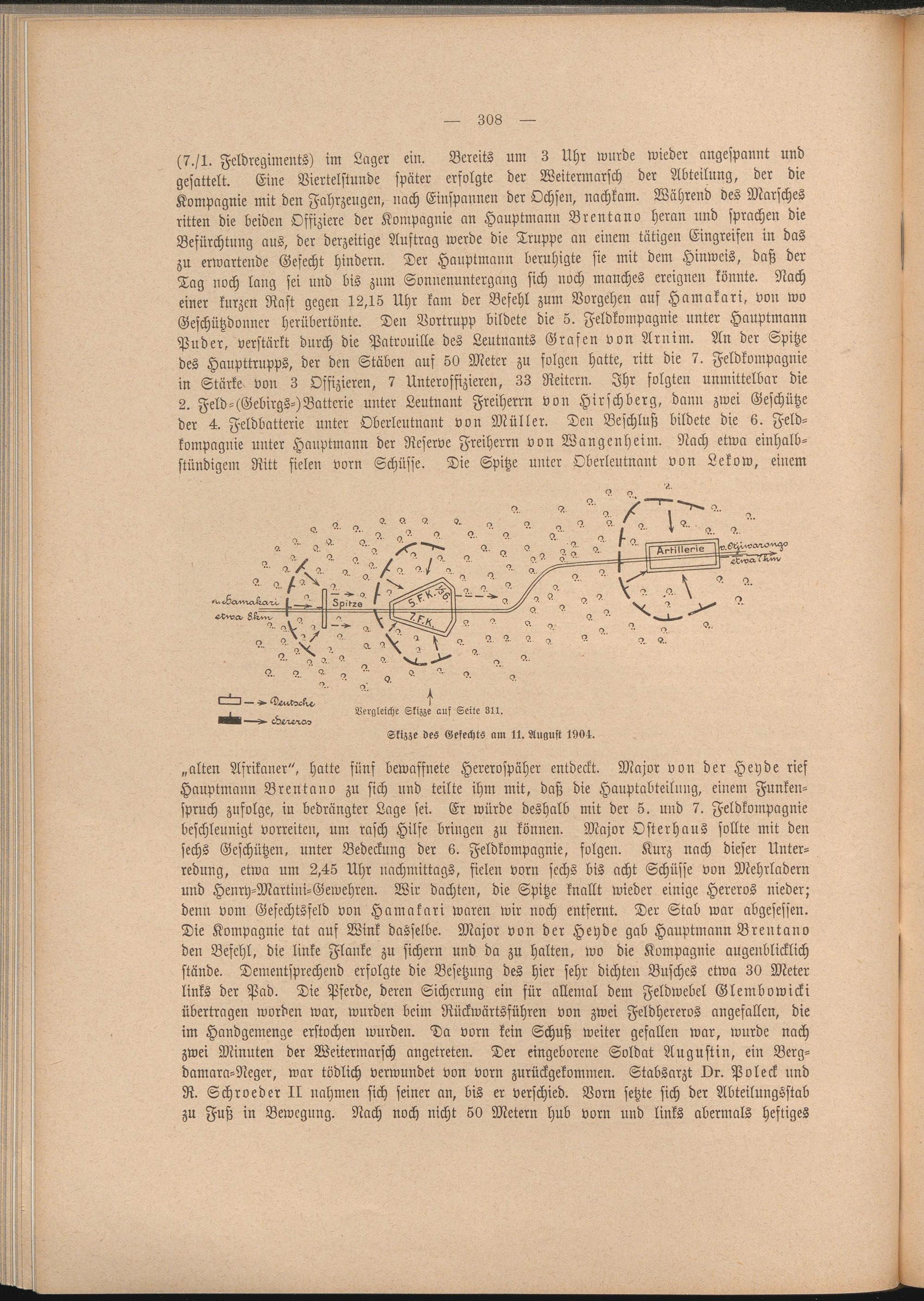 „alten Afrikaner", hatte fünf bewaffnete Hererospäher entdeckt. Major von der Heyde rief Hauptmann Brentano zu sich und teilte ihm mit, daß die Hauptabteilung, einem Funken- spruch zufolge, in bedrängter Lage sei. Er würde deshalb mit der 5. und 7. Feldkompagnie beschleunigt vorreiten, um rasch Hilfe bringen zu können. Major Osterhaus sollte mit den sechs Geschützen, unter Bedeckung der 6. Feldkompagnie, folgen. Kurz nach dieser Unterredung, etwa um 2,45 Uhr nachmittags, fielen vorn sechs bis acht Schüsse von Mehrladern und Henry-Martini-Gewehren. Wir dachten, die Spitze knallt wieder einige Hereros nieder; denn vom Gefechtsfeld von Hamakari waren wir noch entfernt. Der Stab war abgesessen. Die Kompagnie tat auf Wink dasselbe. Major von der Heyde gab Hauptmann Brentano den Befehl, die linke Flanke zu sichern und da zu halten, wo die Kompagnie augenblicklich stände. Dementsprechend erfolgte die Besetzung des hier sehr dichten Busches etwa 30 Meter links der Pad. Die Pferde, deren Sicherung ein für allemal dem Feldwebel Glernbowicki übertragen worden war, wurden beim Rückwärtsführen von zwei Feldhereros angefallen, die im Handgemenge erstochen wurden. Da vorn kein Schuß weiter gefallen war, wurde nach zwei Minuten der Weitermarsch angetreten. Der eingeborene Soldat Augustin, ein Berg- damara-Neger, war tödlich verwundet von vorn zurückgekommen. Stabsarzt Or. Poleck und R. Schroeder II nahmen sich seiner an, bis er verschied. Vorn setzte sich der Abteilungsstab zu Fuß in Bewegung. Nach noch nicht 50 Metern hub vorn und links abermals heftiges