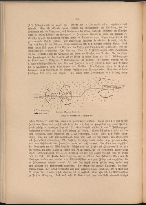 (7./1. Feldregiments) im Lager ein. Bereits um 3 Uhr wurde wieder angespannt und gesattelt. Eine Viertelstunde später erfolgte der Weitermarsch der Abteilung, der die Kompagnie mit den Fahrzeugen, nach Einspannen der Ochsen, nachkam. Während des Marsches ritten die beiden Offiziere der Kompagnie an Hauptmann Brentano heran und sprachen die Befürchtung aus, der derzeitige Auftrag werde die Truppe an einem tätigen Eingreifen in das zu erwartende Gefecht hindern. Der Hauptmann beruhigte sie mit dem Hinweis, daß der Tag noch lang sei und bis zum Sonnenuntergang sich noch manches ereignen könnte. Nach einer kurzen Rast gegen 12,15 Uhr kam der Befehl zum Vorgehen auf Hamakari, von wo Geschützdonner herübertönte. Den Vortrupp bildete die 5. Feldkompagnie unter Hauptmann Puder, verstärkt durch die Patrouille des Leutnants Grafen von Aruim. An der Spitze des Haupttrupps, der den Stäben auf 50 Meter zu folgen hatte, ritt die 7. Feldkompagnie in Stärke von 3 Offizieren, 7 Unteroffizieren, 33 Reitern. Ihr folgten unmittelbar die 2. Feld-(Gebirgs-)Batterie unter Leutnant Freiherrn von Hirschberg, dann zwei Geschütze der 4. Feldbatterie unter Oberleutnant von Müller. Den Beschluß bildete die 6. Feldkompagnie unter Hauptmann der Reserve Freiherrn von Wangenheim. Nach etwa einhalb- stündigem Ritt fielen vorn Schüsse. Die Spitze unter Oberleutnant von Lekow, einem