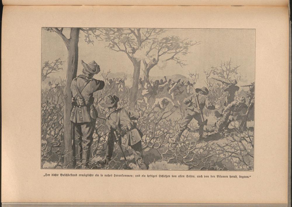 >Der dichte Buschbestnnd ermöglichte ein so nahes Herankommen: und ein heftiges Schienen von allen Seiten, auch von den Bäumen herab, begann.