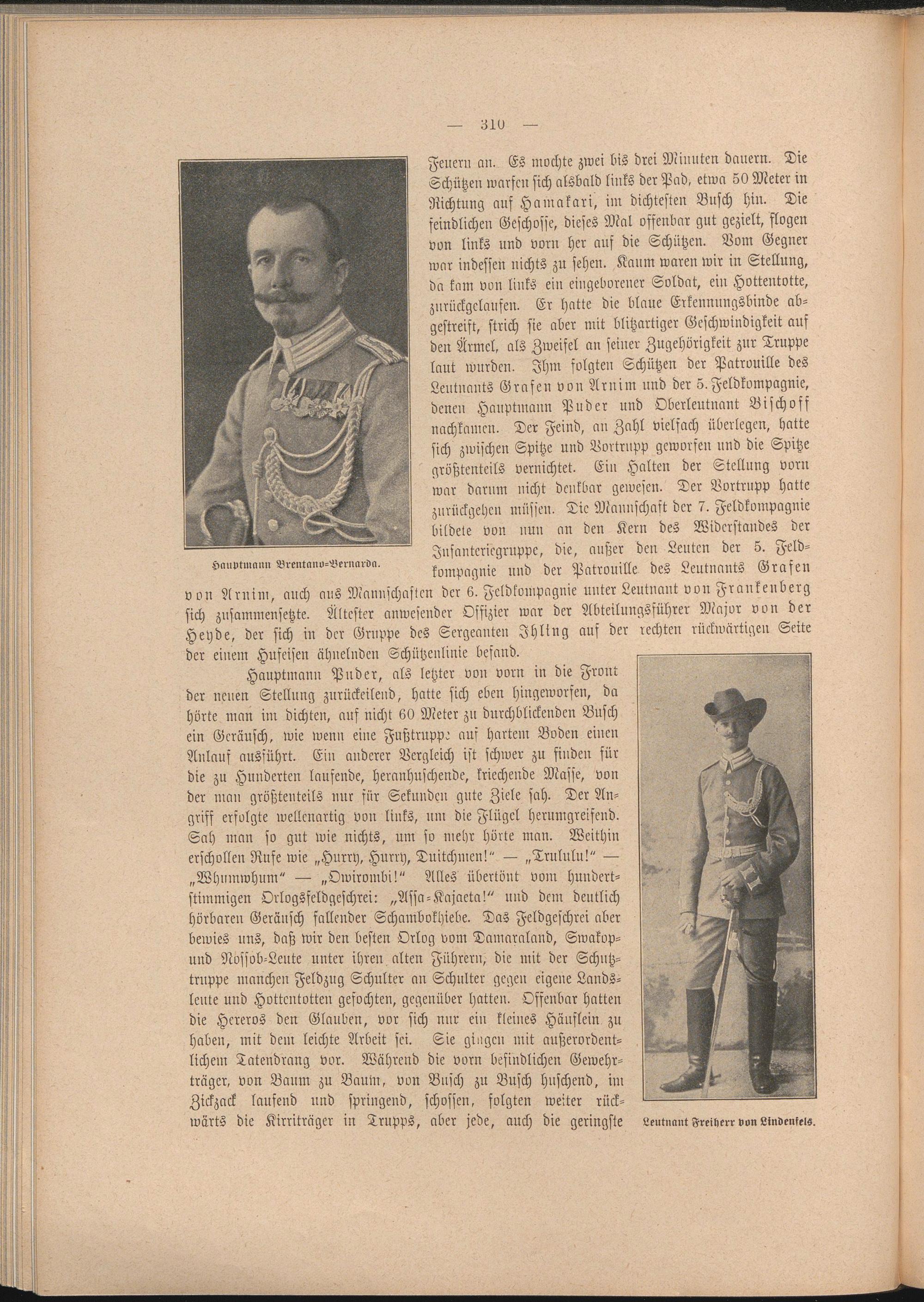 Feuern an. Es mochte zwei bis drei Minuten dauern. Die Schützen warfen sich alsbald links der Pad, etwa 50 Meter in Richtung auf Hamakari, im dichtesten Busch hin. Die feindlichen Geschosse, dieses Mal offenbar gut gezielt, flogen von links und vorn her auf die Schützen. Vorn Gegner war indessen nichts zu sehen. Kaum waren wir in Stellung, da kam von links ein eingeborener Soldat, ein Hottentotte, zurückgelaufen. Er hatte die blaue Erkennungsbinde abgestreift, strich sie aber mit blitzartiger Geschwindigkeit auf den Ärmel, als Zweifel an seiner Zugehörigkeit zur Truppe laut wurden. Ihm folgten Schützen der Patrouille des Leutnants Grasen von Arnim und der S.Feldkompagnie, denen Hanptmann Puder und Oberleutnant Bischofs nachkamen. Der Feind, an Zahl vielfach überlegen, hatte sich zwischen Spitze und Vortrupp geworfen nnd die Spitze größtenteils vernichtet. Ein Halten der Stellung vorn war darum nicht denkbar gewesen. Der Vortrupp hatte zurückgehen müssen. Die Mannschaft der 7. Feldkompagnie bildete von nun an den Kern des Widerstandes der Jnsantcriegruppc, die, außer den Leuten der 5. Feldkompagnie und der Patrouille des Leutnants Grafen von Arnim, auch aus Maunschnslcn der 6. Feldkompagnie unter Leutnant von Frankeuberg sich zusammensetzte. Ältester anwesender Offizier war der Abteilungsführer Major von der Hehde, der sich in der Gruppe des Sergeanten Jhling auf der rechten rückwärtigen Seite der einem Hufeisen ähnelnden Schützenlinie befand.