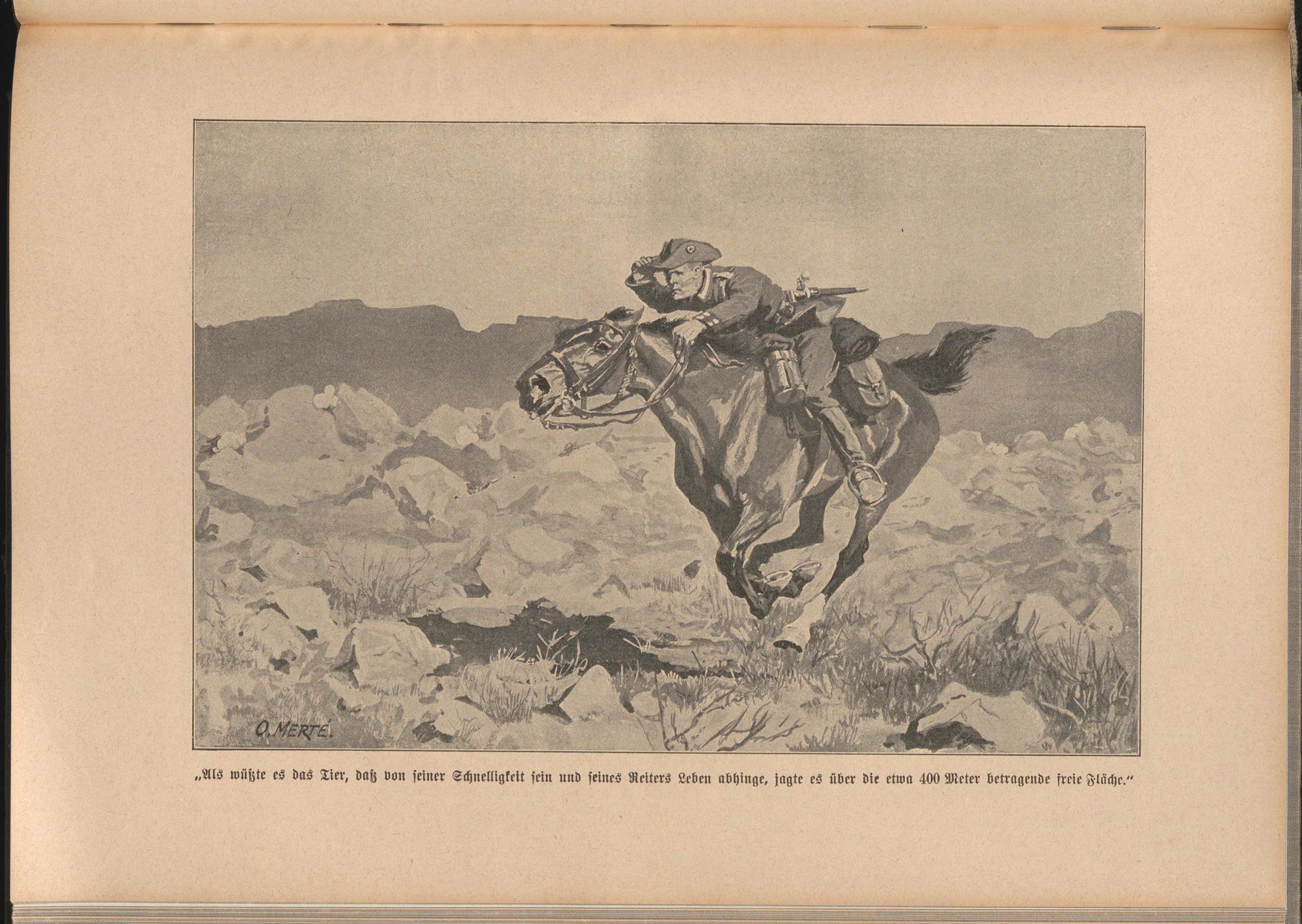 „Als wüszte es das Tier, dasz von seiner Schnelligkeit sein und seines Reiters Leben abhinge, jagte es über die etwa 4VÜ Meter betragende freie Fläche."