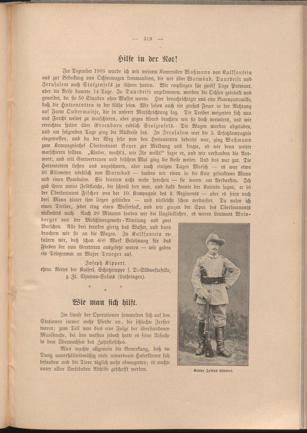 Im Dezember 1905 wurde ich mit meinem Kameraden Waßmann von Kalkfontein aus zur Bedeckung von Ochsenwagen kommandiert, die wir über Warmbad, Duurdrift und Jerusalem nach Stvlzenfels zu führeu hatten. Wir empfingen für zwölf Tage Proviant, aber die Reise dauerte 14 Tage. In Duurdrift angekommen, wurden die Ochsen getränkt und geweidet, da sie 50 Stunden ohne Wasser waren. Hier benachrichtigte uns eine Burenpatrouille, daß die Hottentotten in der Nähe seien. Wir sahen auch ein großes Feuer in der Richtung auf Farm Ondermaitje, die in unserer Marschrichtung lag. Die Treiber weigerten sich nun aus Furcht weiter zu marschieren, aber gegen Abend brachten wir sie doch vorwärts, und wir erreichten später über Groendoru endlich Stvlzenfels. Die Wagen wurden abgeladen,
