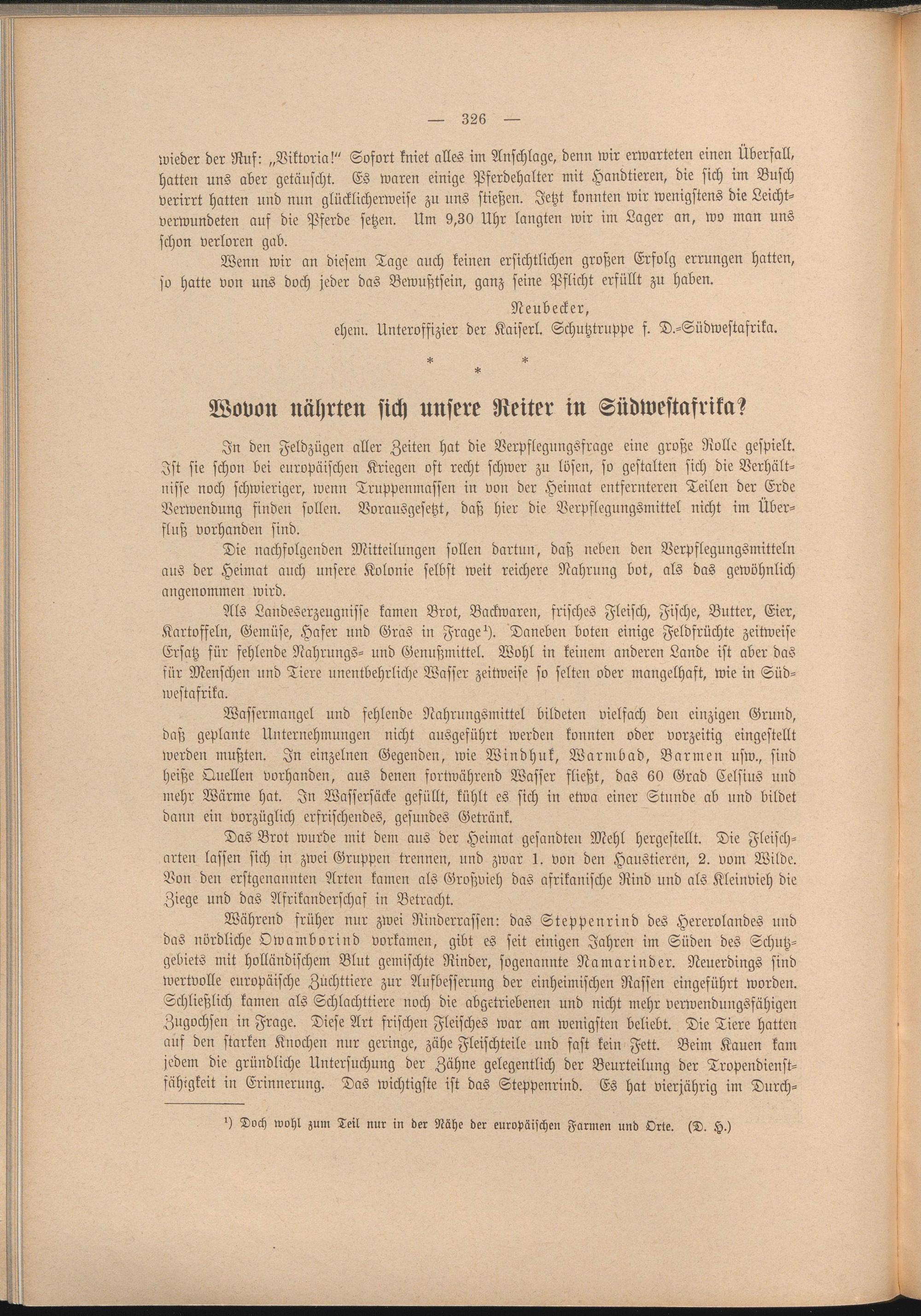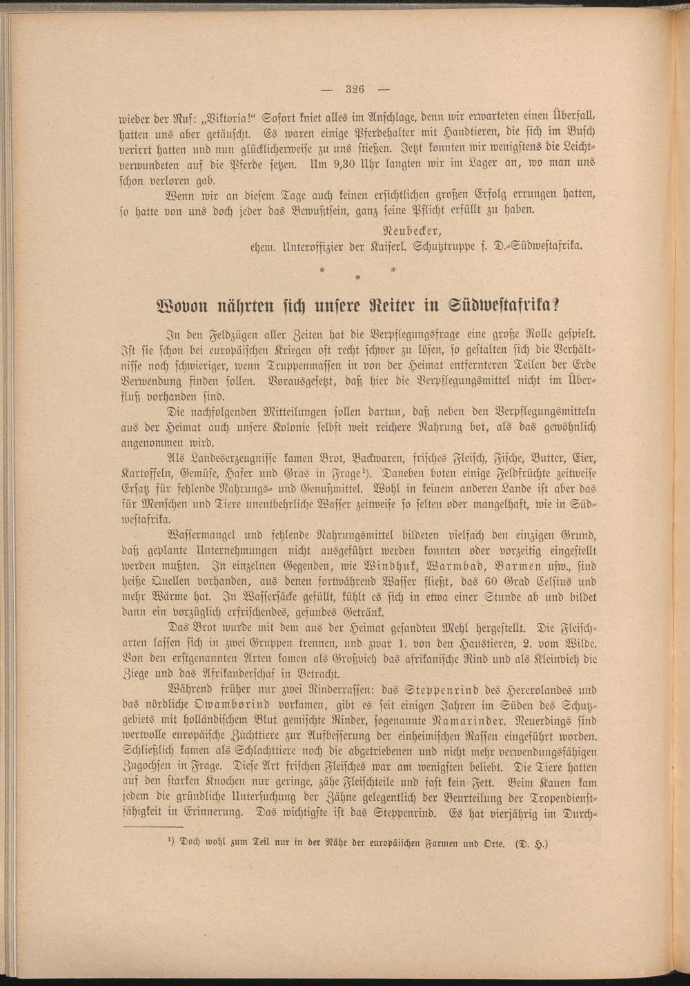 Wassermangel und fehlende Nahrungsmittel bildeten vielfach den einzigen Grund, daß geplante Unternehmungen nicht ausgeführt werden konnten oder vorzeitig eingestellt werden mußten. In einzelnen Gegenden, wie Windhuk, Warmbad, Barmen usw., sind heiße Quellen vorhanden, aus denen fortwährend Wasser fließt, das 60 Grad Celsius und mehr Wärme hat. In Wassersäcke gefüllt, kühlt es sich in etwa einer Stunde ab und bildet dann ein vorzüglich erfrischendes, gesundes Getränk.