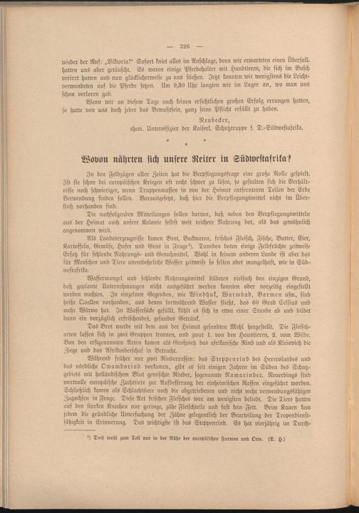 Als Landeserzeugnisse kamen Brot, Backwaren, frisches Fleisch, Fische, Butter, Eier, Kartoffeln, Gemüse, Hafer und Gras in Frage fi. Daneben boten einige Feldfrüchte zeitweise Ersatz für fehlende Nahrungs- und Genußmittel. Wohl in keinem anderen Lande ist aber das für Menschen und Tiere unentbehrliche Wasser zeitweise so selten oder mangelhaft, wie in Südwestafrika.