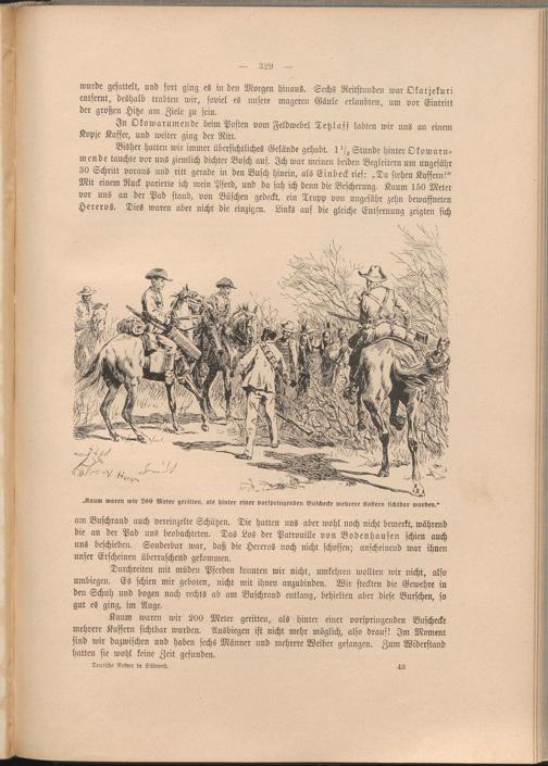 Bisher hatten wir immer übersichtliches Gelände gehabt. 1^ Stunde hinter Okowarumende tauchte vor uns ziemlich dichter Busch auf. Ich war meinen beiden Begleitern um ungefähr 30 Schritt voraus und ritt gerade in den Busch hinein, als Einbeck rief: „Da stehen Kaffern!" Mit einem Ruck parierte ich mein Pferd, und da sah ich denn die Bescherung. Kaum 150 Meter vor uns an der Pad stand, von Büschen gedeckt, ein Trupp von ungefähr zehn bewaffneten Hereros. Dies waren aber nicht die einzigen. Links auf die gleiche Entfernung zeigten sich