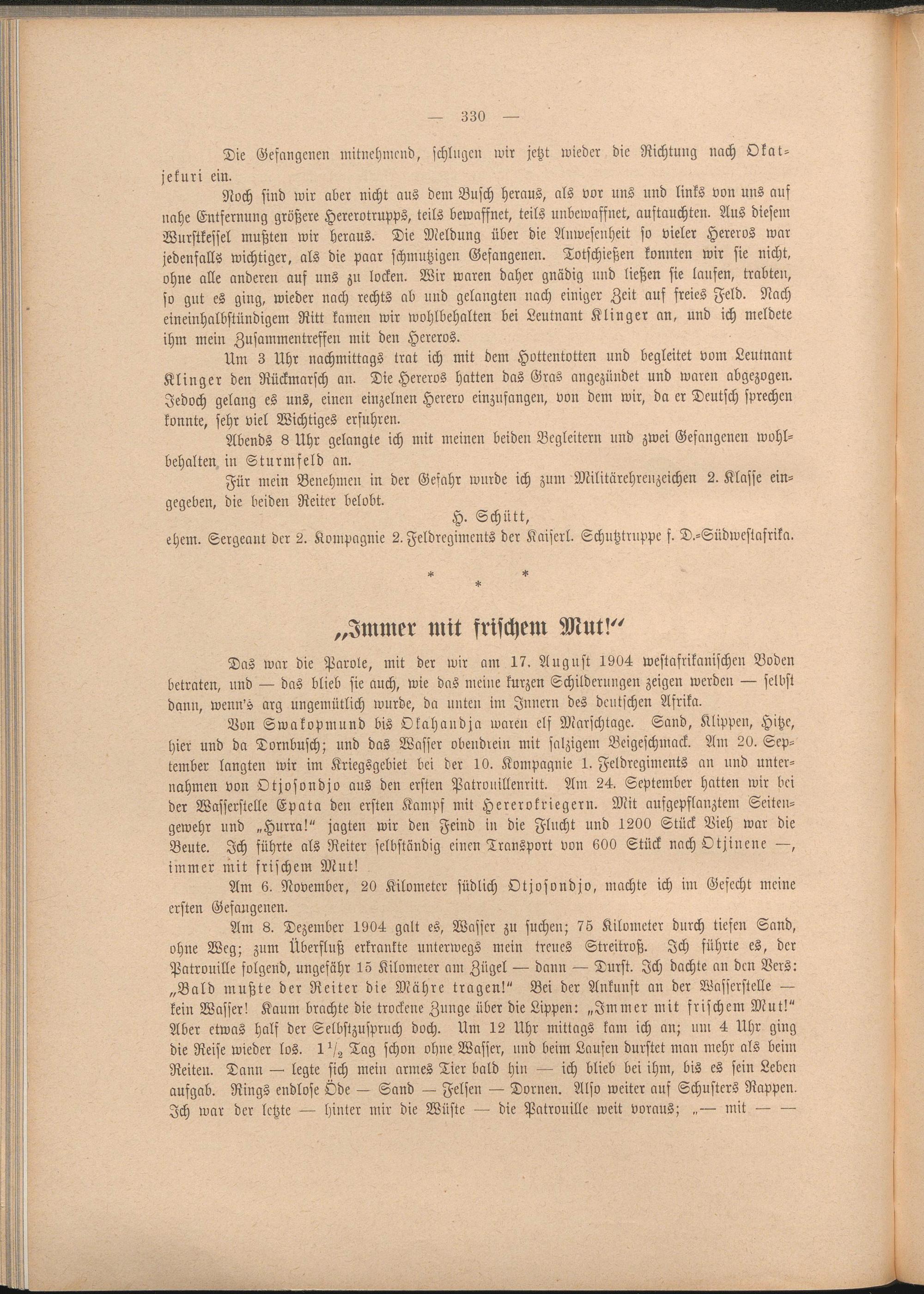 Bon Swakopmund bis Okahandja waren elf Marschtage. Sand, Klippen, Hitze, hier und da Dornbusch; und das Wasser obendrein mit salzigem Beigeschmack. Am 20. September langten wir im Kriegsgebiet bei der 10. Kompagnie 1. Feldregiments an und unternahmen von Otjosondjo aus den ersten Patrouillenritt. Am 24. September hatten wir bei der Wasserstelle Epata den ersten Kampf mit Hererokriegern. Mit aufgepflanztem Seitengewehr und „Hurra!" jagten wir den Feind in die Flucht und 1200 Stück Vieh war die Beute. Ich führte als Reiter selbständig einen Transport von 600 Stück nach Otjinene —, immer mit frischem Mut!
