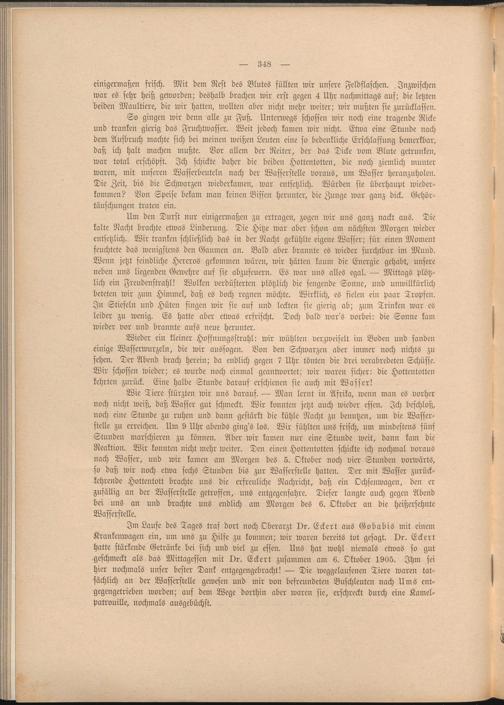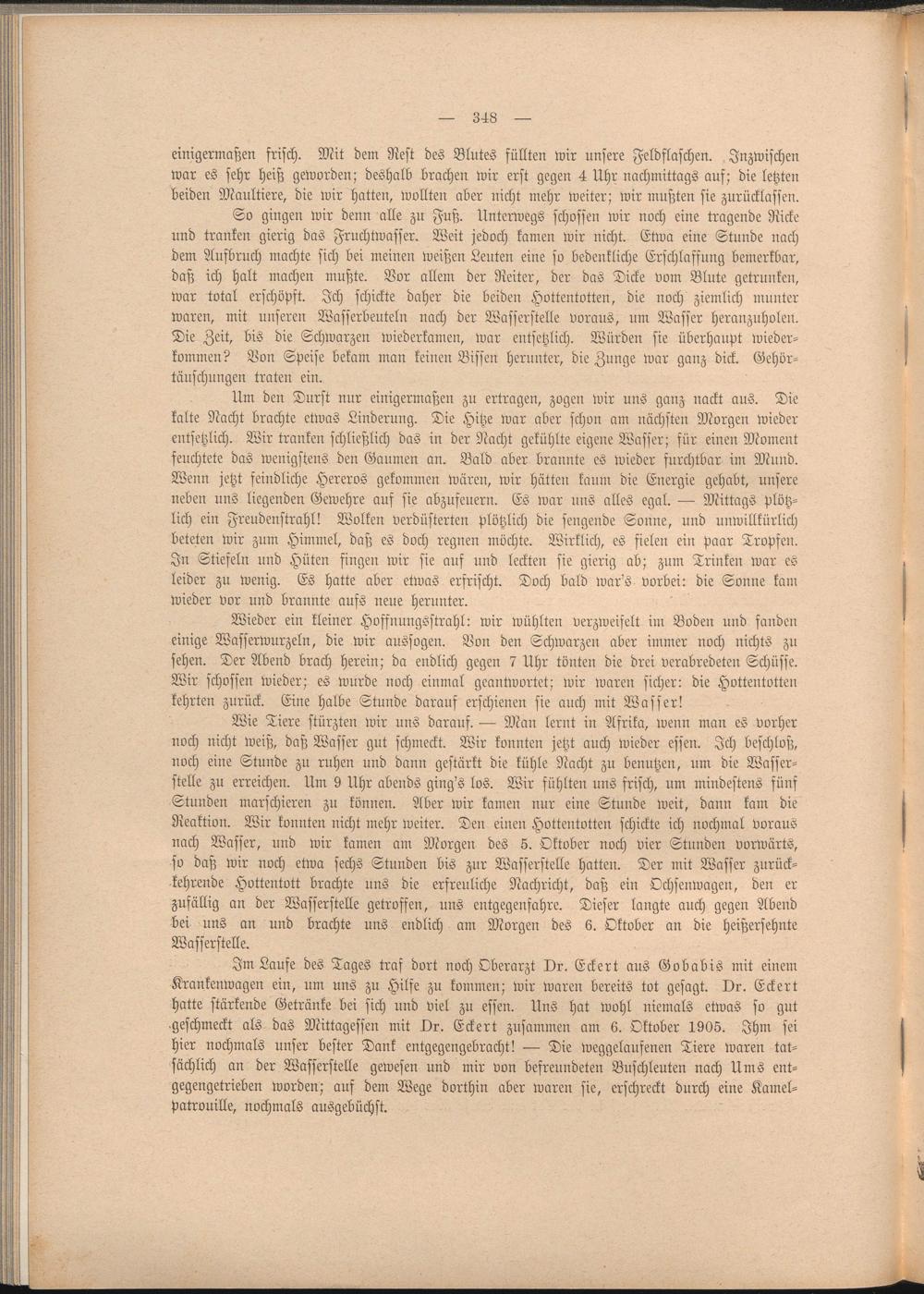 Im Laufe des Tages traf dort noch Oberarzt Dr. Eckert aus Gobabis mit einem Krankenwagen ein, um uns zu Hilfe zu kommen; wir waren bereits tot gesagt. Dr. Eckert hatte stärkende Getränke bei sich und viel zu essen. Uns hat Wohl niemals etwas so gut geschmeckt als das Mittagessen mit Dr. Eckert zusammen am 6. Oktober 1905. Ihm sei hier nochmals unser bester Dank entgegengebracht! — Die weggelaufenen Tiere waren tatsächlich an der Wasserstelle gewesen und mir von befreundeten Buschleuten nach Ums entgegengetrieben worden; auf dem Wege dorthin aber waren sie, erschreckt durch eine Kamelpatrouille, nochmals ausgebüchst.
