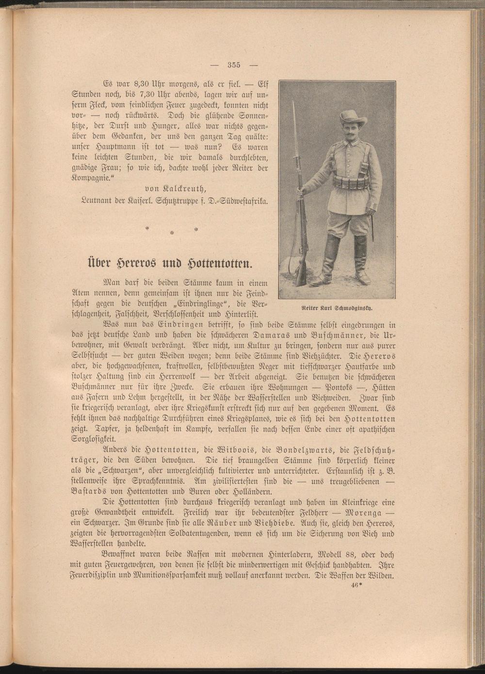 Die Hottentotten sind durchaus kriegerisch veranlagt und haben im Kleinkriege eine große Gewandtheit entwickelt. Freilich war ihr bedeutendster Feldherr — Morenga — ein Schwarzer. Im Grunde sind sie alle Räuber und Viehdiebe. Auch sie, gleich den Hereros, zeigten die hervorragendsten Soldatentugenden, wenn es sich um die Sicherung von Vieh und Wasserstellen handelte.