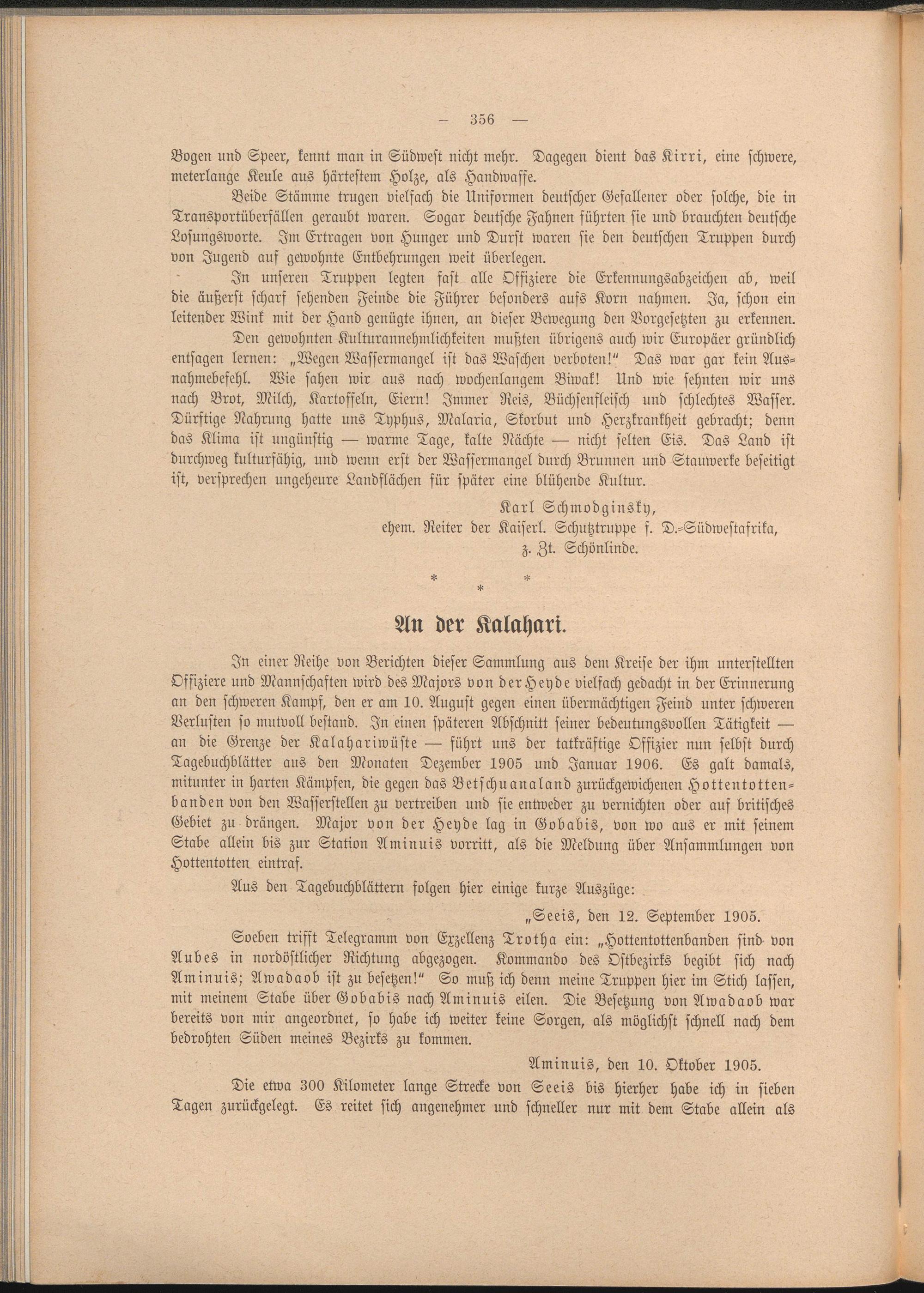 In einer Reihe von Berichten dieser Sammlung aus dem Kreise der ihm unterstellten Offiziere und Mannschaften wird des Majors von derHeyde vielfach gedacht in der Erinnerung an den schweren Kampf, den er am 10. August gegen einen übermächtigen Feind unter schweren Verlusten so mutvoll bestand. In einen späteren Abschnitt seiner bedeutungsvollen Tätigkeit — an die Grenze der Kalahariwüste — führt uns der tatkräftige Offizier nun selbst durch Tagebuchblätter aus den Monaten Dezember 1905 und Januar 1906. Es galt damals, mitunter in harten Kämpfen, die gegen das Betschuanaland zurückgewichenen Hottentottenbanden von den Wasserstellen zu vertreiben und sie entweder zu vernichten oder auf britisches Gebiet zu drängen. Major von der Heyde lag in Gobabis, von wo aus er mit seinem Stäbe allein bis zur Station Aminuis vorritt, als die Meldung über Ansammlungen von Hottentotten eintraf.