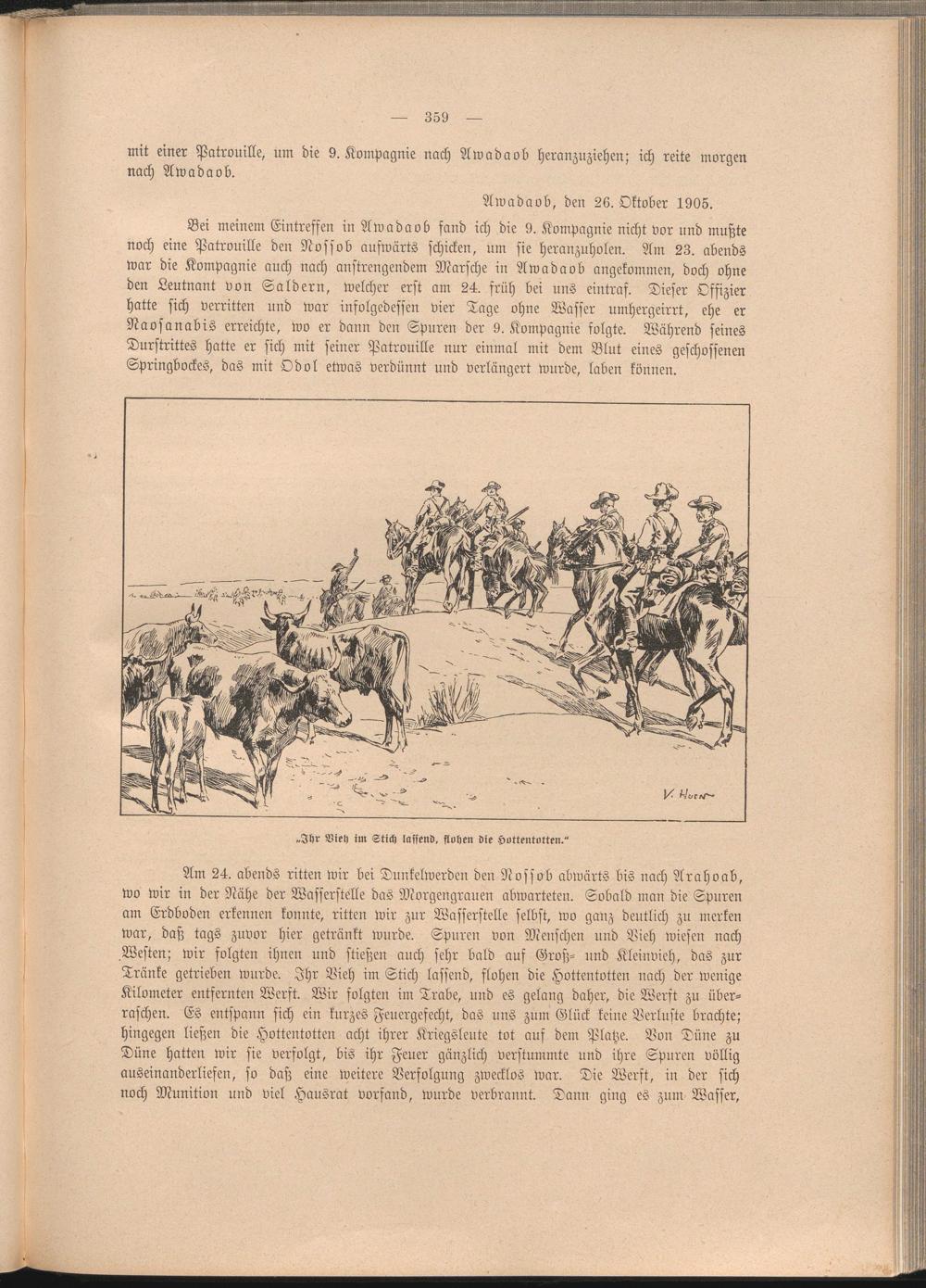 Am 24. abends ritten wir bei Dunkelwerden den Nossob abwärts bis nach Arahoab, wo wir in der Nähe der Wasserstelle das Morgengrauen abwarteten. Sobald man die Spuren am Erdboden erkennen konnte, ritten wir zur Wasserstelle selbst, wo ganz deutlich zu merken war, daß tags zuvor hier getränkt wurde. Spuren von Menschen und Vieh wiesen nach Westen; wir folgten ihnen und stießen auch sehr bald auf Groß- und Kleinvieh, das zur Tränke getrieben wurde. Ihr Vieh im Stich lassend, flohen die Hottentotten nach der wenige Kilometer entfernten Werft. Wir folgten im Trabe, und es gelang daher, die Werft zu überraschen. Es entspann sich ein kurzes Feuergcfecht, das uns zum Glück keine Verluste brachte; hingegen ließen die Hottentotten acht ihrer Kriegsleute tot auf dem Platze. Von Düne zu Düne hatten wir sie verfolgt, bis ihr Feuer gänzlich verstummte und ihre Spuren völlig auseinanderliefen, so daß eine weitere Verfolgung zwecklos war. Die Werft, in der sich noch Munition und viel Hausrat vorfand, wurde verbrannt. Dann ging es zum Wasser,