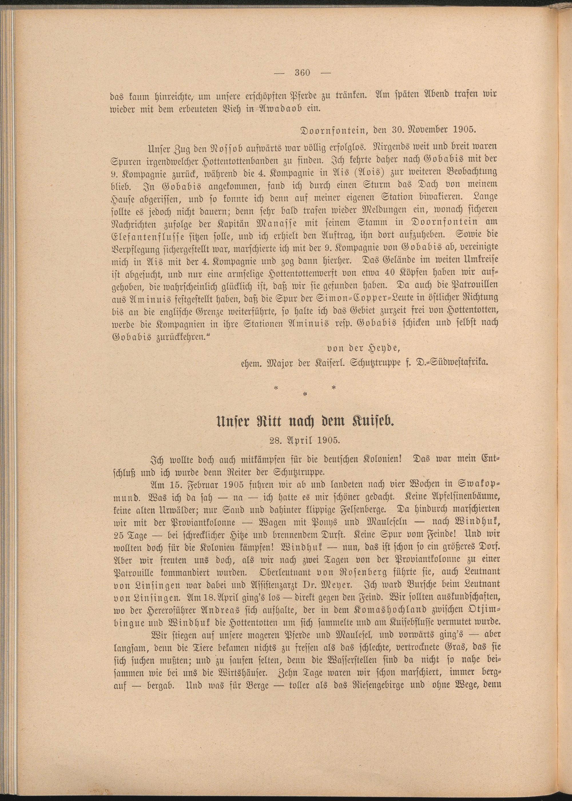 Am 15. Februar 1905 fuhren wir ab und landeten nach vier Wochen in Swakop- mund. Was ich da sah — na — ich hatte es mir schöner gedacht. Keine Apfelsinenbäume, keine alten Urwälder; nur Sand und dahinter klippige Felsenberge. Da hindurch marschierten wir mit der Proviantkolonne — Wagen mit Ponys und Mauleseln — nach Windhuk, 25 Tage — bei schrecklicher Hitze und brennendem Durst. Keine Spur vom Feinde! Und wir wollten doch für die Kolonien kämpfen! Windhnk — nun, das ist schon so ein größeres Dorf. Aber wir freuten uns doch, als wir nach zwei Tagen von der Proviantkolonue zu einer Patrouille kommandiert wurden. Oberleutnant von Rosenberg führte sie, auch Leutnant von Linsingen war dabei und Assistenzarzt Dr. Meyer. Ich ward Bursche beim Leutnant von Linsingen. Am 18.April ging's los — direkt gegen den Feind. Wir sollten auskundschaften, wo der Hereroführer Andreas sich aufhalte, der iu dem Komashochland zwischen Otjim- bingue und Windhuk die Hottentotten um sich sammelte und am Kuisebflusse vermutet wurde.