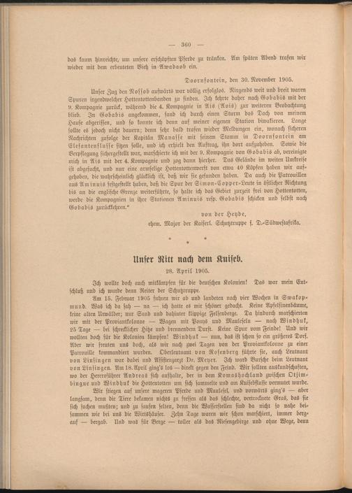 Unser Zug den Nossob aufwärts war völlig erfolglos. Nirgends weit und breit waren Spuren irgendwelcher Hottentottenbanden zu finden. Ich kehrte daher nach Gobabis mit der 9. Kompagnie zurück, während die 4. Kompagnie in Ais (Avis) zur weiteren Beobachtung blieb. In Gobabis angekommen, fand ich durch einen Sturm das Dach von meinem Hause abgerissen, und so konnte ich denn auf meiner eigenen Station biwakieren. Lange sollte es jedoch nicht dauern; denn sehr bald trafen wieder Meldungen ein, wonach sicheren Nachrichten zufolge der Kapitän Manasse mit seinem Stamm in Doornfontein am Elefantenflusse fitzen solle, und ich erhielt den Auftrag, ihn dort aufzuheben. Sowie die Verpflegung sichergestellt war, marschierte ich mit der 9. Kompagnie von Gobabis ab, vereinigte mich in Ais mit der 4. Kompagnie und zog dann hierher. Das Gelände im weiten Umkreise ist abgesucht, und nur eine armselige Hottentottenwerft von etwa 40 Köpfen haben wir aufgehoben, die wahrscheinlich glücklich ist, daß wir sie gefunden haben. Da auch die Patrouillen aus Amiuuis festgestellt haben, daß die Spur der Simou-Copper-Leute in östlicher Richtung bis au die englische Grenze weiterführte, so halte ich das Gebiet zurzeit frei von Hottentotten, werde die Kompagnien in ihre Stationen Amiuuis resp. Gobabis schicken und selbst nach Gobabis zurückkehren."