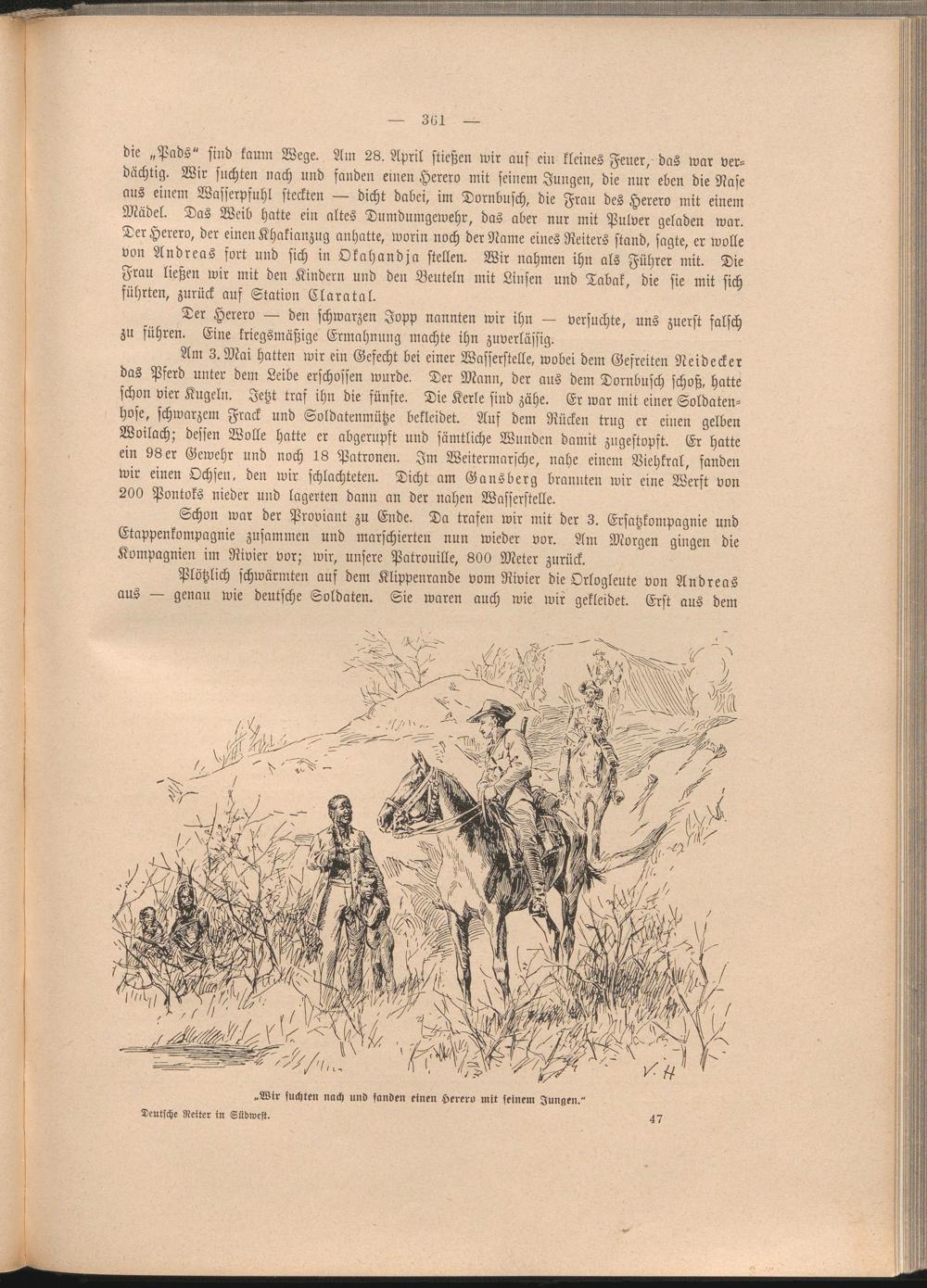 Am 3. Mai hatten wir ein Gefecht bei einer Wasserstelle, wobei dem Gefreiten Neidecker das Pferd unter dem Leibe erschossen wurde. Der Mann, der ans dem Dornbusch schoß, hatte schon vier Kugeln. Jetzt traf ihn die fünfte. Die Kerle sind zähe. Er war mit einer Soldatenhose, schwarzem Frack und Soldatenmütze bekleidet. Auf dem Rücken trug er einen gelben Woilach; dessen Wolle hatte er abgerupft und sämtliche Wunden damit zugestopft. Er hatte ein 98 er Gewehr und noch 18 Patronen. Im Weitermarsche, nahe einem Viehkral, fanden wir einen Ochsen, den wir schlachteten. Dicht am Gansberg brannten wir eine Werst von 200 Pontoks nieder und lagerten dann an der nahen Wasserstelle.