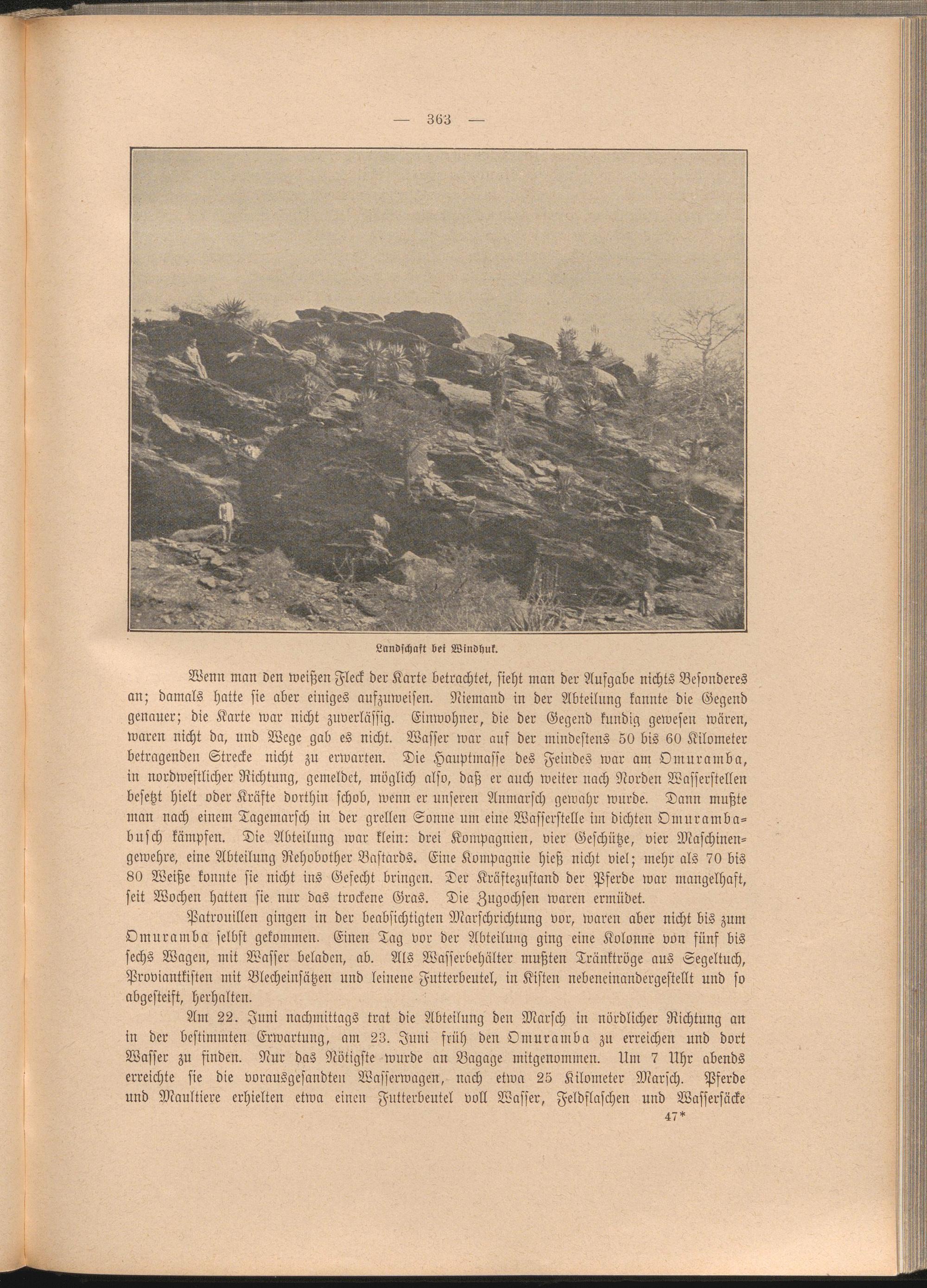 Am 22. Juni nachmittags trat die Abteilung den Marsch in nördlicher Richtung an in der bestimmten Erwartung, am 23. Juni früh den Omuramba zu erreichen und dort Wasser zu finden. Nur das Nötigste wurde an Bagage mitgenommen. Um 7 Uhr abends erreichte sie die vorausgesandteu Wasserwagen, nach etwa 25 Kilometer Marsch. Pferde und Maultiere erhielten etwa einen Futterbeutel voll Wasser, Feldflaschen und Wassersäcke